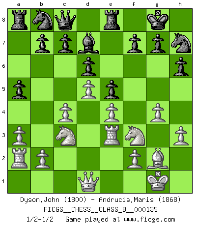 Last move : 1/2-1/2 2011 March 6 21:43:42 [Event "FICGS__CHESS__CLASS_B__000135"] [Site "FICGS"] [Date "2011.01.07"] [Round "1"] [White "Dyson,John"] [Black "Andrucis,Maris"] [Result "1/2-1/2"] [WhiteElo "1800"] [BlackElo "1868"] 1.c4 e5 2.g3 Nc6 3.Nc3 Bc5 4.Bg2 Nf6 5.Nf3 O-O 6.O-O d6 7.d3 h6 8.a3 a5 9.e3 Bg4 10.h3 Bf5 11.d4 Bb6 12.Re1 Re8 13.d5 Nb8 14.e4 Bd7 15.Ra2 Qc8 16.g4 Nh7 17.Be3 Bxe3 18.Rxe3 1/2-1/2 English Opening Kingside Castling by player Black (move 5) Kingside Castling by player White (move 6) This chess game ended in a draw. Follow this game move after move (download)Chess is a part of culture and if a culture is declining then Chess too will decline. (Mikhail Botvinnik) Jeder Fehler erscheint unglaublich dumm, wenn andre ihn begehen. (Georg Christoph Lichtenberg) Un mal día en el Ajedrez, es mejor que cualquier buen día en el trabajo. (Anonymous) La guerre est enfant de la passion, la passion est enfant du narcissisme et le narcissisme est l'enfant. (...) Une autre partie ? (Thibault de Vassal) Gambling is the son of avarice and the father of despair. (French proverb)