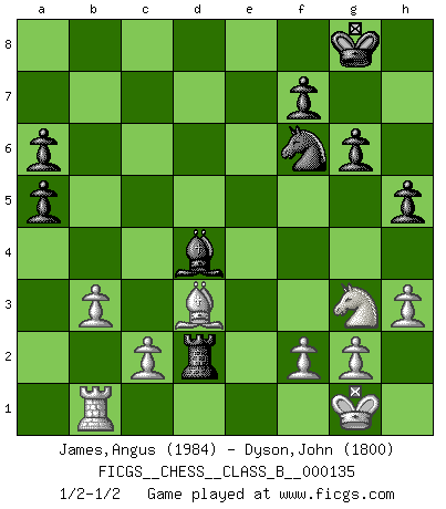 Last move : 1/2-1/2 2011 July 7 17:36:23 [Event "FICGS__CHESS__CLASS_B__000135"] [Site "FICGS"] [Date "2011.01.07"] [Round "1"] [White "James,Angus"] [Black "Dyson,John"] [Result "1/2-1/2"] [WhiteElo "1984"] [BlackElo "1800"] 1.e4 d6 2.d4 Nf6 3.Nc3 g6 4.Nf3 Bg7 5.Be2 O-O 6.O-O c6 7.a4 Nbd7 8.h3 Qc7 9.Be3 b6 10.Qd2 Bb7 11.a5 bxa5 12.Ra3 e6 13.Rd1 Rfd8 14.Bf4 e5 15.Bh6 a6 16.dxe5 Nxe5 17.Bg5 Rd7 18.Qf4 Ne8 19.Qe3 Nxf3+ 20.Bxf3 Nf6 21.Bf4 Re8 22.Qd3 Qd8 23.Rb3 c5 24.Bxd6 Bxe4 25.Bxe4 Bf8 26.Rb8 Qxb8 27.Bxb8 Rxd3 28.Bxd3 Rxb8 29.b3 Rd8 30.Ra1 c4 31.Bxc4 Rd2 32.Bd3 Bb4 33.Ne2 h5 34.Ng3 Bc3 35.Rb1 Bd4 1/2-1/2 Pirc : Classical system, 5.Be2 Kingside Castling by player Black (move 5) Kingside Castling by player White (move 6) This chess game ended in a draw. Follow this game move after move (download)Nothing excites jaded Grandmasters more than a theoretical novelty. (Dominic Lawson) Versuche, dich von der Sklaverei der Eröffnungsvarianten zu befreien. Stattdessen soll man gewisse Typenpositionen erlernen, die man eingehend analysiert. (Aaron Nimzowitsch) Todos los jugadores de Ajedrez deberían tener un pasatiempo. (Savielly Tartakower) Les réformistes prétendent que les progrès de la théorie conduiront à la disparition des échecs, et qu'il faut, pour leur rendre vie, en remanier les règles. En réalité, qu'exprime cette affirmation? Le mépris de l'intuition, de l'imagination et de tous les autres éléments qui font des échecs un art. (Alexander Alekhine) No, no, you're not thinking; you're just being logical. (Niels Bohr)