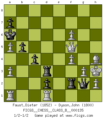 Last move : 1/2-1/2 2011 June 12 15:18:17 [Event "FICGS__CHESS__CLASS_B__000135"] [Site "FICGS"] [Date "2011.01.07"] [Round "1"] [White "Faust,Dieter"] [Black "Dyson,John"] [Result "1/2-1/2"] [WhiteElo "1852"] [BlackElo "1800"] 1.d4 d5 2.c4 c6 3.Nf3 Nf6 4.Nc3 e6 5.Bg5 dxc4 6.e4 b5 7.e5 h6 8.Bh4 g5 9.Nxg5 hxg5 10.Bxg5 Nbd7 11.g3 Rg8 12.Bh4 Bb7 13.Bg2 Qc7 14.exf6 O-O-O 15.Qh5 Rg6 16.Ne4 Bb4+ 17.Ke2 c5 18.Rhd1 Bd5 19.a3 Ba5 20.dxc5 Nxc5 21.Nxc5 Qxc5 22.Bxd5 exd5 23.b4 Qc6 24.bxa5 d4 25.Qf5+ Kb7 26.f3 d3+ 27.Kf2 Rd5 28.Qe4 Rg8 29.Qe7+ Ka6 30.Kg2 Re8 31.Qxf7 Re2+ 32.Kh3 d2 33.Qh7 Rd3 34.f4 Rf2 35.Qf5 Qg2+ 36.Kg4 Qf3+ 37.Kh3 Qg2+ 1/2-1/2 QGD Slav : 4.Nc3 Queenside Castling by player Black (move 14) This chess game ended in a draw. Follow this game move after move (download)Chess is above all, a fight ! (Emanuel Lasker) Ich verlor meine Bürgerrechte, mein Gehalt wurde mir nicht mehr bezahlt und ich wurde zensiert und durfte nicht mehr ins Ausland reisen. [nach dem Match Fischer-Taimanov 6:0] (Mark Taimanov) Evita las multitudes. Haz independientemente tu propio razonamiento. Trata de ser el jugador de Ajedrez, no la pieza de Ajedrez. (Ralph Charell) Ne tendez aucun piège pour le plaisir ! Ne jouez rien dans l'espoir que l'adversaire réagisse de façon stupide ! Prenez toujours pour acquis que l'adversaire va trouver le meilleur coup ! Ne jouez jamais de coup dans l'espoir que l'adversaire ne voie pas la menace ! Chacun de vos coups doit améliorer la position d'une façon ou d'une autre. However beautiful the strategy, you should occasionally look at the results. (Winston Churchill)