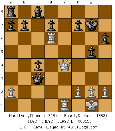 Last move : 1-0 2011 February 6 16:24:40 [Event "FICGS__CHESS__CLASS_B__000135"] [Site "FICGS"] [Date "2011.01.07"] [Round "1"] [White "Martinez,Chapo"] [Black "Faust,Dieter"] [Result "1-0"] [WhiteElo "1918"] [BlackElo "1852"] 1.d4 Nf6 2.c4 e6 3.Nc3 c5 4.d5 exd5 5.cxd5 Bd6 6.Nf3 O-O 7.Bg5 h6 8.Bh4 Bc7 9.d6 Ba5 10.Qc2 Nc6 11.e3 Re8 12.Be2 g5 13.Bg3 Ne4 14.O-O Bxc3 15.bxc3 Qf6 16.Bd3 Nxd6 17.Rad1 Kg7 18.e4 c4 19.e5 Nxe5 20.Bxe5 Rxe5 21.Nxe5 Qxe5 22.Rfe1 Qf6 23.Be4 Nxe4 24.Qxe4 Qxc3 25.Rd6 1-0 Queen's pawn game Kingside Castling by player Black (move 6) Kingside Castling by player White (move 14) Player White won this chess game. Follow this game move after move (download)The Pin is mightier than the sword. (Fred Reinfeld) Im Blitz ist es einfacher mit einer Figur weniger anzugreifen, als sich mit einer Mehrfigur zu verteidigen. (Mikhail Nekhemyevich Tal) El Ajedrez es un mar en el cual un mosquito puede beber y un elefante puede bañarse. (Refrán Hindú) Les échecs sont un jeu par leur forme, un art par leur essence et une science par sa difficulté d'acquisition. Ils peuvent vous procurer autant de plaisir qu'un bon livre ou une belle musique, mais vous n'aurez une réelle joie que si vous arrivez à bien jouer. (Tigran Petrosian) Wikichess, chess moves explained by 'experimented' players. (Thibault de Vassal)