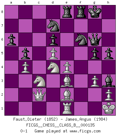 Last move : 0-1 2011 June 16 11:20:39 [Event "FICGS__CHESS__CLASS_B__000135"] [Site "FICGS"] [Date "2011.01.07"] [Round "1"] [White "Faust,Dieter"] [Black "James,Angus"] [Result "0-1"] [WhiteElo "1852"] [BlackElo "1984"] 1.d4 Nf6 2.c4 g6 3.Nc3 Bg7 4.e4 d6 5.f3 O-O 6.Nge2 c5 7.d5 e6 8.Ng3 exd5 9.cxd5 h5 10.Be2 Nh7 11.Nf1 Qh4+ 12.g3 Qe7 13.Ne3 Nd7 14.O-O a6 15.Nc4 b5 16.Na5 Nb8 17.Bf4 Bh3 18.Re1 Bd4+ 19.Kh1 g5 20.Bd2 Bf2 21.Qc2 Bxe1 22.Rxe1 f5 23.a3 Qf6 24.b4 cxb4 25.axb4 Nd7 26.Nc6 Rae8 27.Be3 fxe4 28.fxe4 Qg6 29.Bd3 Qf7 30.Be2 Nhf6 31.Nd4 Qg6 0-1 King's Indian : Saemisch, 5...O-O Kingside Castling by player Black (move 5) Kingside Castling by player White (move 14) Player Black won this chess game. Follow this game move after move (download)The most powerful weapon in Chess is to have the next move. (David Bronstein) Warum muß ich gegen diesen IDIOTEN verlieren? (Aaron Nimzowitsch) Si tu oponente te ofrece un empate, trata de averiguar porque piensa él que esta en una posición peor. (Nigel Short) Même si vous avez un bon coup à faire, regardez toujours s'il n'y en a pas un qui lui soit préférable. (Pedro Damiano) My poor ole parrot... Is not in the circulation of displays ....poo hoo hoo :) (Wayne Lowrance's enigma)