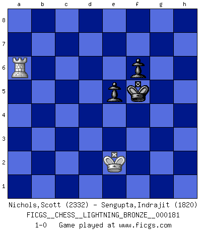 Last move : 1-0 2011 January 7 22:43:40 [Event "FICGS__CHESS__LIGHTNING_BRONZE__000181"] [Site "FICGS"] [Date "2011.01.07"] [Round "1"] [White "Nichols,Scott"] [Black "Sengupta,Indrajit"] [Result "1-0"] [WhiteElo "2332"] [BlackElo "1820"] 1.e4 e5 2.Nf3 Nc6 3.Bb5 a6 4.Ba4 Nf6 5.O-O d6 6.Re1 b5 7.Bb3 Be7 8.c3 O-O 9.h3 Bb7 10.d4 Re8 11.Ng5 Rf8 12.Qd3 exd4 13.cxd4 Nd7 14.Nf3 Nb4 15.Qd1 c5 16.a3 Nc6 17.Be3 Nxd4 18.Nxd4 cxd4 19.Bxd4 Nc5 20.Nc3 Bf6 21.Bd5 Bxd5 22.Bxf6 Qxf6 23.Qxd5 Rac8 24.Rad1 Rfd8 25.Qd2 Qe5 26.Nd5 Kh8 27.f3 h6 28.Qf2 Kh7 29.Re2 Na4 30.Red2 Re8 31.Nb4 a5 32.Nd5 Rc6 33.g3 Rb8 34.Kg2 Nb6 35.Re2 Qe6 36.Qe3 Nc4 37.Qa7 Qe8 38.Qe7 a4 39.g4 Qxe7 40.Nxe7 Rc5 41.Nd5 Re8 42.h4 Kg8 43.g5 Re6 44.f4 h5 45.f5 Re8 46.Kf2 Kh7 47.Rd4 Ra8 48.f6 Re8 49.fxg7 Kxg7 50.Kg3 Rh8 51.Rf2 Re8 52.Nf6 Rh8 53.Rd3 R5c8 54.Rc3 Rb8 55.R3c2 Rbc8 56.Rf3 Rb8 57.Nd5 Ne5 58.R3f2 Rhd8 59.Nf4 b4 60.Nxh5+ Kh8 61.Rf6 bxa3 62.Rh6+ Kg8 63.Nf6+ Kg7 64.bxa3 Rb3+ 65.Kg2 Nf3 66.Rh7+ Kg6 67.Rf2 Ne1+ 68.Kf1 Nf3 69.Rg2 Rb1+ 70.Kf2 Nxg5 71.hxg5 Rb2+ 72.Kf3 Rxg2 73.Kxg2 Rb8 74.Rh3 Rb2+ 75.Kf3 Kxg5 76.Nd5 Rb3+ 77.Kg2 Rb2+ 78.Kf1 Rb1+ 79.Ke2 Rb2+ 80.Kd1 Kg4 81.Rd3 Kg5 82.Nc3 Rb3 83.Kc2 Rxa3 84.e5 dxe5 85.Ne4+ Kf4 86.Rxa3 Kxe4 87.Kd2 f6 88.Ke2 Kf4 89.Rxa4+ Kf5 90.Ra6 1-0 Ruy Lopez : Steinitz defense deferred (Russian defense) Kingside Castling by player White (move 5) Kingside Castling by player Black (move 8) 10 pieces endgame at move 75 : White KRNPP , Black KRPPP WHITE : King + 1 Rook 1 Knight 2 Pawns BLACK : King + 1 Rook 3 Pawns 9 pieces endgame at move 83 : White KRNP , Black KRPPP WHITE : King + 1 Rook 1 Knight 1 Pawn BLACK : King + 1 Rook 3 Pawns 8 pieces endgame at move 84 : White KRN , Black KRPPP WHITE : King + 1 Rook 1 Knight BLACK : King + 1 Rook 3 Pawns 7 pieces endgame at move 86 : White KRN , Black KPPP WHITE : King + 1 Rook 1 Knight BLACK : King + 3 Pawns 6 pieces endgame at move 86 : White KR , Black KPPP WHITE : King + 1 Rook BLACK : King + 3 Pawns 5 pieces endgame at move 89 : White KR , Black KPP WHITE : King + 1 Rook BLACK : King + 2 Pawns Player White won this chess game. Follow this game move after move (download)Blessed be the memory of him who gave the world this immortal game. (A. G. Gardiner) Die FIDE ist dabei in die Hände der russischen Mafia zu fallen. (Larry Evans) No existe un remordimiento como el remordimiento del Ajedrez. (H. G. Wells) Les ravages du H expliquent la différence de niveau entre Tal et Thal [Abergel]. You know what they say : You lie down with the Devil, you wake up in Hell. (Horatio Caine, C.S.I. Miami)