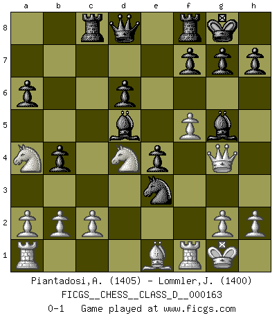 Last move : 0-1 2011 February 1 3:38:18 [Event "FICGS__CHESS__CLASS_D__000163"] [Site "FICGS"] [Date "2011.01.08"] [Round "1"] [White "Piantadosi,Angelo"] [Black "Lommler,Jan Peter"] [Result "0-1"] [WhiteElo "1405"] [BlackElo "1400"] 1.e4 c5 2.Nf3 d6 3.d4 cxd4 4.Nxd4 Nf6 5.Nc3 a6 6.Bc4 e6 7.Bb3 b5 8.O-O Be7 9.f4 O-O 10.f5 b4 11.Na4 e5 12.Nf3 Bb7 13.Bd5 Nxd5 14.exd5 e4 15.Nd4 Bxd5 16.Be3 Nd7 17.Qg4 Ne5 18.Qg3 Bh4 19.Qf4 Nc4 20.Bf2 Bg5 21.Qg4 Rc8 22.Be1 Ne3 0-1 Sicilian : Najdorf, Lipnitzky attack Kingside Castling by player White (move 8) Kingside Castling by player Black (move 9) Player Black won this chess game. Follow this game move after move (download)Fischer sacrificed virtually everything most of us weakies (to use his term) value, respect, and cherish, for the sake of an artful, often beautiful board game, for the ambivalent privilege of being its greatest master. (Paul Kollar) Mit Schach schule ich mein Gefühl für Geometrie, was für Tennis und Schach gleichermaßen wichtig ist. (Boris Becker) Estaba muy claro de que el punto vulnerable del Gran Maestro Americano (Bobby Fischer) radicaba en las posiciones de doble filo, colgantes, irracionales, donde el siempre falló en encontrar un triunfo aún en una posición de clara victoria. (Efim Geller) Les échecs sont utiles à l'exercice de la faculté de penser et à celle de l'imagination. Car nous devons posséder une méthode élaborée pour atteindre des buts partout où nous devons conduire notre raison. (Leibnitz) There is no vagueness without wind. (Chinese proverb)