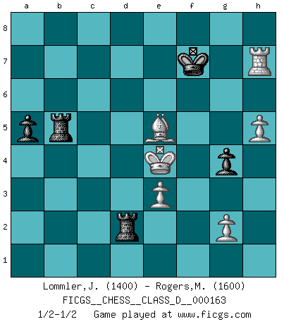 Last move : 1/2-1/2 2011 January 23 23:16:43 [Event "FICGS__CHESS__CLASS_D__000163"] [Site "FICGS"] [Date "2011.01.08"] [Round "1"] [White "Lommler,Jan Peter"] [Black "Rogers,Michael"] [Result "1/2-1/2"] [WhiteElo "1400"] [BlackElo "1600"] 1.d4 Nf6 2.c4 e6 3.Nc3 Bb4 4.Qc2 d5 5.cxd5 exd5 6.Bg5 h6 7.Bh4 c5 8.dxc5 g5 9.Bg3 Ne4 10.e3 Qa5 11.Rc1 Qxa2 12.Bb5+ Bd7 13.Bxd7+ Nxd7 14.Nge2 Nxc3 15.Nxc3 Qc4 16.Rd1 Nxc5 17.h4 g4 18.Rd4 Qa6 19.Be5 Rg8 20.Qe2 Bxc3+ 21.bxc3 Rg6 22.h5 Qxe2+ 23.Kxe2 Ra6 24.Rxg4 Ra2+ 25.Kf3 O-O-O 26.c4 Ne4 27.cxd5 Rxf2+ 28.Kxe4 f5+ 29.Kd4 fxg4 30.Rc1+ Kd7 31.Rc7+ Ke8 32.Rxb7 Rd2+ 33.Ke4 R8xd5 34.Rh7 a5 35.Rxh6 Rb5 36.Rh8+ Kf7 37.Rh7+ 1/2-1/2 Nimzo-Indian : Classical, Noa variation, 5.cd ed Queenside Castling by player Black (move 25) This chess game ended in a draw. Follow this game move after move (download)Chess, like love, is infectious at any age. (Flohr) Früher wurde jeder komplizierte Zug, jedes interessante Opfer mit großem Beifall und Enthusiasmus aufgenommen. Heute schaltet man einfach seinen Fritz an, und man kann sehen, was los ist, ob der Zug geht oder nicht. (Vladimir Kramnik) Uno por uno, yo los acribillé, mi superioridad muy pronto se volvio aparente. (Jose Capablanca) 'L'échange des dames est un coup dur pour les deux adversaires...' Un journaliste lors d'une partie du match Spassky-Fischer Follow your passion, and success will follow you. (Arthur Buddhold)