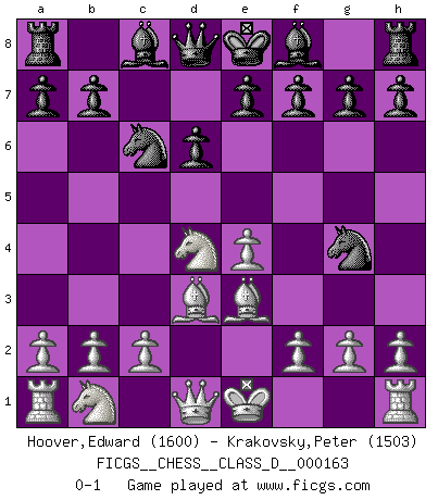 Last move : 0-1 2011 February 12 22:18:27 [Event "FICGS__CHESS__CLASS_D__000163"] [Site "FICGS"] [Date "2011.01.08"] [Round "1"] [White "Hoover,Edward"] [Black "Krakovsky,Peter"] [Result "0-1"] [WhiteElo "1600"] [BlackElo "1503"] 1.e4 c5 2.Nf3 d6 3.d4 cxd4 4.Nxd4 Nf6 5.Bd3 Nc6 6.Be3 Ng4 0-1 Sicilian Player Black won this chess game. Follow this game move after move (download)In complicated positions, Bobby Fischer hardly had to be afraid of anybody. (Paul Keres) Schach ist das Spiel, das die Verrückten gesund hält. (Albert Einstein) Juega la Apertura como un libro, el Juego Medio como un mago y los Finales como una máquina. (Spielmann) Des points faibles ou des trous dans la position de l'adversaire doivent être occupés par des pièces et non pas par des pions. (Siegbert Tarrasch) Life is painting a picture, not doing a sum. (Oliver Wendell Holmes, Jr.)
