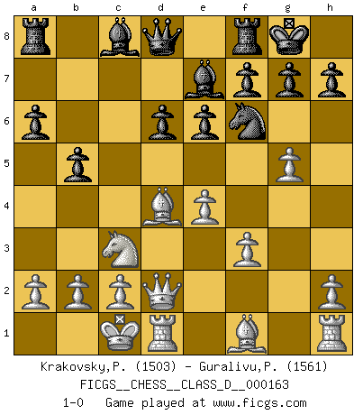 Last move : 1-0 2011 March 17 11:49:9 [Event "FICGS__CHESS__CLASS_D__000163"] [Site "FICGS"] [Date "2011.01.08"] [Round "1"] [White "Krakovsky,Peter"] [Black "Guralivu,Paul-Iosif"] [Result "1-0"] [WhiteElo "1503"] [BlackElo "1561"] 1.e4 c5 2.Nf3 d6 3.d4 cxd4 4.Nxd4 Nf6 5.Nc3 a6 6.Be3 Nc6 7.f3 e6 8.Qd2 Be7 9.O-O-O O-O 10.g4 Nxd4 11.Bxd4 b5 12.g5 1-0 Sicilian : Najdorf, Byrne (English) attack Queenside Castling by player White (move 9) Kingside Castling by player Black (move 9) Player White won this chess game. Follow this game move after move (download)A chess genius has died; a loss for humanity. (Viktor Kortchnoi, about Bobby Fischer's death) Meine Liebe ist Schach, Schach, Schach. Ich muss jeden Tag Schach spielen, deshalb fühle ich mich so stark. (Miguel Najdorf) Haz el enroque temprano y seguido. (Rob Sillars) La guerre est enfant de la passion, la passion est enfant du narcissisme et le narcissisme est l'enfant. (...) Une autre partie ? (Thibault de Vassal) Industry executives and analysts often mistakenly talk about strategy as if it were some kind of chess match. But in chess, you have just two opponents, each with identical resources, and with luck playing a minimal role. The real world is much more like a poker game, with multiple players trying to make the best of whatever hand fortune has dealt them. In our industry, Bill Gates owns the table until someone proves otherwise. (David Moschella, 'Computerworld')