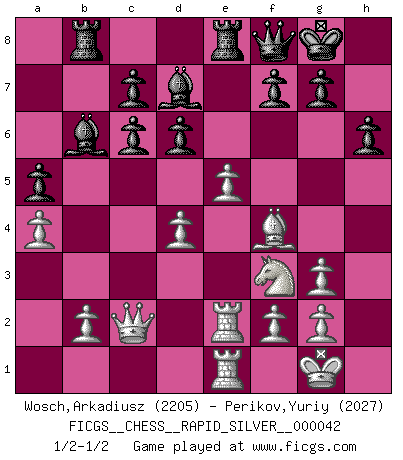 Last move : 1/2-1/2 2011 April 1 0:0:20 [Event "FICGS__CHESS__RAPID_SILVER__000042"] [Site "FICGS"] [Date "2011.01.08"] [Round "1"] [White "Wosch,Arkadiusz"] [Black "Perikov,Yuriy"] [Result "1/2-1/2"] [WhiteElo "2205"] [BlackElo "2027"] 1.e4 e5 2.Nf3 Nc6 3.Bc4 Bc5 4.c3 Nf6 5.d3 d6 6.O-O O-O 7.Bb3 a6 8.Nbd2 h6 9.Re1 Ng4 10.Re2 Nf6 11.Nf1 Nh5 12.d4 Ba7 13.Be3 Bg4 14.Rd2 exd4 15.cxd4 Nf6 16.Ng3 Nh5 17.Bd5 Nxg3 18.hxg3 Bb6 19.Bxc6 bxc6 20.Qc2 Bd7 21.e5 a5 22.Bf4 Qe7 23.Re2 Rfe8 24.Rae1 Qf8 25.a3 Rad8 26.a4 Rb8 1/2-1/2 Giuoco Piano Kingside Castling by player White (move 6) Kingside Castling by player Black (move 6) This chess game ended in a draw. Follow this game move after move (download)I'm not afraid of Spassky. The world knows I'm the best. You don't need a match to prove it. (Bobby Fischer) Fischer: 'Remis!?' Uhlmann: 'Aber es muss doch dreimal Zugwiederholung sein!' Fischer: 'Sie nehmen das Remis an, wie ich es sage, sonst spiele ich weiter und werde Sie dann schlagen!' (Robert James Fischer) El Ajedrez es despiadado: debes de estar preparado para matar gente. (Nigel Short) Assurément je connaissais par expérience le mystérieux attrait de ce jeu royal, le seul entre tous les jeux inventés par les hommes qui échappe souverainement à la tyrannie du hasard, le seul où l'on ne doive sa victoire qu'à son intelligence ou plutôt à une certaine forme d'intelligence. Mais n'est-ce pas déjà le limiter injurieusement que d'appeler les échecs un jeu ? N'est-ce pas une science, un art ou quelque chose qui, comme le cercueil de Mahomet entre ciel et terre, est suspendu entre l'un et l'autre, et qui réunit un nombre incroyable de contraires ? [...] C'est une pensée qui ne mène à rien, une mathématique qui n'établit rien, un art qui ne laisse pas d'uvre, une architecture sans matière; et il l'a prouvé néanmoins qu'il était plus durable, à sa manière, que les livres ou que tout autre monument, ce jeu unique qui appartient à tous les peuples et à tous les temps, et dont personne ne sait quel dieu en fit don à la terre pour tuer l'ennui, pour aiguiser l'esprit et stimuler l'âme. Où commence-t-il, où finit-il ? (Stefan Zweig) There will be no order, only chaos. (Sol Robeson in Pi by Darren Aronofsky)