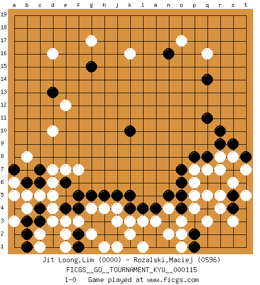 Last move : 1-0 2011 May 26 18:46:18 [Event "FICGS__GO__TOURNAMENT_KYU__000115"] [Site "FICGS"] [Date "2011.01.08"] [Round "1"] [Black "Jit Loong,Lim"] [White "Rozalski,Maciej"] [Result "1-0"] [Rating 1 "0000"] [Rating 2 "0596"] 1.e4 q16 2.q8 d16 3.o4 k16 4.q11 r4 5.q14 d10 6.n16 o17 7.d13 d7 8.k5 d4 9.k10 r7 10.g15 g17 11.r10 r8 12.r9 q7 13.p8 p7 14.o7 p5 15.o5 p4 16.q6 p6 17.r6 s6 18.s5 r5 19.q4 q3 20.s7 q5 21.t6 s8 22.t8 t7 23.s9 t5 24.s4 s3 25.o6 o3 26.c4 d3 27.p2 o2 28.n3 n2 29.m2 m3 30.n1 o1 31.p1 n4 32.m4 l3 33.l2 k2 34.k1 l1 35.m1 l1 36.j2 j3 37.k4 k3 38.l4 j4 39.j5 g4 40.h3 h4 41.f4 f3 42.f5 d5 43.g5 e3 44.h5 f7 45.n5 e12 46.c3 c5 47.g3 g2 48.h2 h1 49.f2 j1 50.d2 e2 51.f1 c2 52.d1 c1 53.b2 e1 54.b1 b4 55.b3 b5 56.b6 b8 57.a4 a3 58.a5 a6 59.a7 a5 60.c6 d6 61.e6 e7 62.c7 1-0 Here are the names of the openings (joseki) played in the four corners : Corner q16 : q16 q11 Hoshi (Hwajeom, Seongjeom, Xingwei`) 4-4 Point. The star or hoshi (4-4) point, emphasizing influence at the potential expense of territory. Corner d16 : d16 d13 Hoshi (Hwajeom, Seongjeom, Xingwei`) 4-4 Point. The star or hoshi (4-4) point, emphasizing influence at the potential expense of territory. Niken Takagakari (Dukan Nop'dakeolch'im, E`r Gaojia, 2-Space High Approach). Black 2 is a light approach move. Rarely played in even games, Black 2 is typically employed in handicap games. White continues with 6-4 or 3-10. In Korean Sunjang Baduk White has a stone on 8-4. Corner d4 : e4 d7 Takamoku (Gomok, Gaomu`) 5-4 Point. The takamoku (high) point (5-4). With its emphasis on influence, the 5-4 point complements the 4-4 (hoshi) point in creating an influence-oriented fuseki. Player Black won this Go (weiqi, baduk) game. Follow this game move after move (download)Don't overlook the edge of the board. (Anonymous) All the troubles of the world come from being unable to sit alone in a quiet room. (Blaise Pascal)