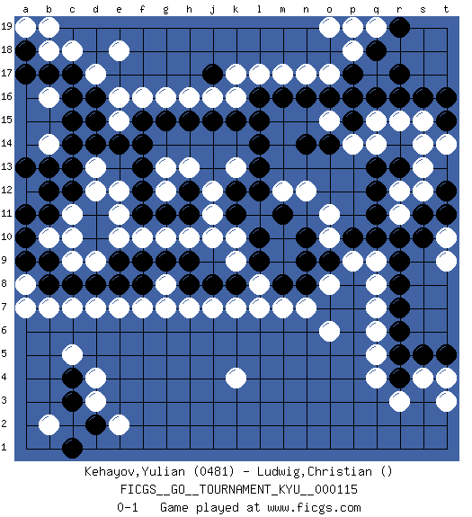 Last move : 0-1 2011 February 22 16:16:12 [Event "FICGS__GO__TOURNAMENT_KYU__000115"] [Site "FICGS"] [Date "2011.01.08"] [Round "1"] [Black "Kehayov,Yulian"] [White "Ludwig,Christian"] [Result "0-1"] [Rating 1 "0481"] 1.c15 q4 2.q16 d4 3.r7 q6 4.q11 k4 5.d10 k16 6.m16 m17 7.l16 l17 8.j17 k17 9.k15 j16 10.j15 h16 11.h15 g16 12.g15 f16 13.f15 e16 14.d15 e15 15.e14 k10 16.m8 m7 17.k8 k7 18.j8 j7 19.h8 h7 20.f8 l8 21.l9 l7 22.n8 k9 23.l10 g8 24.g9 g7 25.h9 h10 26.f9 l11 27.k11 j11 28.k12 j10 29.m11 g12 30.h12 j12 31.h11 g10 32.g11 f10 33.f11 e10 34.e9 e11 35.d11 e12 36.f12 k13 37.l12 g13 38.f13 d12 39.c12 d9 40.d8 c9 41.c8 c11 42.b11 c10 43.b13 e7 44.e8 d7 45.b8 b7 46.b9 b10 47.a10 a12 48.b12 a8 49.a9 a7 50.d16 d17 51.c17 c18 52.b17 b18 53.a18 b19 54.n16 n17 55.o16 o17 56.l13 b14 57.c14 b16 58.c16 d13 59.c13 q9 60.r9 q8 61.r8 q7 62.p10 p9 63.o9 n7 64.r6 q5 65.q10 o8 66.n10 o6 67.p17 p18 68.q18 o19 69.r4 r3 70.r5 s4 71.s5 t3 72.t5 t4 73.a11 f7 74.d14 r15 75.r16 q15 76.p15 p14 77.q13 s13 78.s11 s14 79.s16 s15 80.t15 r12 81.q12 q14 82.r13 c7 83.a13 a19 84.a17 e18 85.l15 o15 86.p16 n12 87.l14 m12 88.n14 o11 89.o14 t14 90.t16 s12 91.t12 t10 92.t11 r11 93.s10 t9 94.r10 o10 95.n9 h13 96.f14 q19 97.r19 p19 98.r17 pass 99.pass pass 100.c3 d3 101.d2 e2 102.c1 b2 103.c4 c5 0-1 Here are the names of the openings (joseki) played in the four corners : Corner q4 : q4 r7 Hoshi (Hwajeom, Seongjeom, Xingwei`) 4-4 Point. The star or hoshi (4-4) point, emphasizing influence at the potential expense of territory. Niken Kakari (Dukan Keolch'im, E`r Gua`jiao~, 2-Space Low Approach). White typically answers by 7-3 or 3-5 (which is not joseki). Corner d4 : d4 j8 Hoshi (Hwajeom, Seongjeom, Xingwei`) 4-4 Point. The star or hoshi (4-4) point, emphasizing influence at the potential expense of territory. Player White won this Go (weiqi, baduk) game. Follow this game move after move (download)On the second line six die, eight live. (Anonymous) Luck never gives; it only lends. (Swedish proverb)