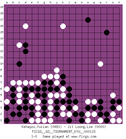 Last move : 1-0 2011 May 4 17:33:11 [Event "FICGS__GO__TOURNAMENT_KYU__000115"] [Site "FICGS"] [Date "2011.01.08"] [Round "1"] [Black "Kehayov,Yulian"] [White "Jit Loong,Lim"] [Result "1-0"] [Rating 1 "0481"] [Rating 2 "0000"] 1.r15 k16 2.q4 q10 3.d4 d16 4.c10 h4 5.l4 j9 6.o17 c13 7.j3 c6 8.d6 d7 9.e6 e7 10.g6 e5 11.d5 c5 12.f5 e4 13.e3 f4 14.g4 f3 15.g3 f2 16.e2 c4 17.c3 d2 18.c2 e1 19.d3 b3 20.b2 a2 21.b4 b1 22.f6 f7 23.g7 g8 24.h7 h8 25.b5 c7 26.d12 j7 27.j6 h3 28.g2 f1 29.j4 h2 30.j2 g1 31.g5 h1 32.k7 j8 33.k8 k6 34.l6 k5 35.l5 j5 36.h6 c1 37.d1 k3 38.k4 h5 39.a1 a4 40.a3 a6 41.b6 b7 42.d13 k2 43.l3 l2 44.m2 m1 45.n1 o1 46.n2 m3 47.l1 o2 48.o3 o4 49.p3 p4 50.q3 p2 51.q2 q1 52.r1 s1 53.r2 s2 54.s3 t3 55.s4 s5 56.t4 t1 57.m4 1-0 This go game has been lost on time (started : 2011.01.08 19:46:43) Here are the names of the openings (joseki) played in the four corners : Corner d4 : d4 h4 Hoshi (Hwajeom, Seongjeom, Xingwei`) 4-4 Point. The star or hoshi (4-4) point, emphasizing influence at the potential expense of territory. Player Black won this Go (weiqi, baduk) game. Follow this game move after move (download)Beginner's games are surprising, often incoherent and incomprehensible. When you improve, your game gains in consistency but flirts with stupidity: you become satisfied with truisms and mechanical movements, you try to obtain a feeling for clearness and style the easy way. (Pierre Audouard) Players are not good because they find tactics, it is about the way to find the positions in which those tactics are hidden. (Luc-Olivier Leclerc)