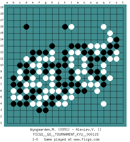 Last move : 1-0 2011 May 15 6:10:42 [Event "FICGS__GO__TOURNAMENT_KYU__000115"] [Site "FICGS"] [Date "2011.01.08"] [Round "1"] [Black "Wyngaarden,Martin"] [White "Alexiev,Valeri"] [Result "1-0"] [Rating 1 "0391"] 1.d16 q4 2.d4 q16 3.k16 q10 4.d10 k4 5.k10 l16 6.g3 l10 7.l9 l11 8.k11 l12 9.k12 m9 10.l13 k9 11.l8 k8 12.l7 k7 13.k6 l6 14.j7 m8 15.m7 n7 16.m6 l5 17.j9 k5 18.j8 j6 19.k7 h7 20.m13 m12 21.n13 o13 22.n12 n11 23.o12 p12 24.o11 n10 25.o10 n9 26.o9 o8 27.p9 q9 28.p8 o7 29.q8 r8 30.p11 p13 31.q11 r11 32.q12 q13 33.r12 s12 34.r13 r14 35.n6 p7 36.q7 p6 37.s13 s11 38.s14 r15 39.h5 h6 40.j5 j4 41.h4 h8 42.g9 h9 43.h10 g8 44.f8 g6 45.f6 g5 46.g4 f5 47.e5 f4 48.f3 f7 49.e6 f9 50.g10 e8 51.d8 e7 52.e9 e10 53.d9 f10 54.e11 f11 55.f12 g11 56.g12 h11 57.j10 h12 58.h13 d7 59.c7 d6 60.c6 e4 61.d5 c5 62.c4 b5 63.b4 b6 64.b7 d11 65.e12 c8 66.b8 c9 67.c10 1-0 This go game has been lost on time (started : 2011.01.08 19:46:43) Here are the names of the openings (joseki) played in the four corners : Corner q4 : q4 l9 Hoshi (Hwajeom, Seongjeom, Xingwei`) 4-4 Point. The star or hoshi (4-4) point, emphasizing influence at the potential expense of territory. Player Black won this Go (weiqi, baduk) game. Follow this game move after move (download)Don't make territory near thickness. (Anonymous) Hello Thibault, if I have had a plan (and I had one, I hope), I have forgotten it during the last week... - Hello Heinz-Georg. What do you mean a plan ? (Anonymous players, during a Big Chess game)