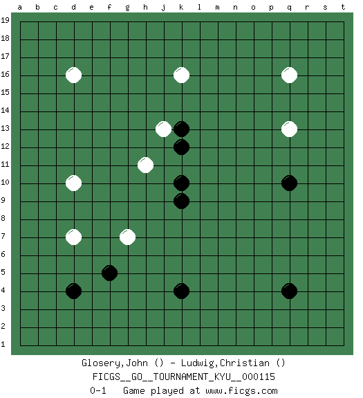 Last move : 0-1 2011 January 15 22:24:30 [Event "FICGS__GO__TOURNAMENT_KYU__000115"] [Site "FICGS"] [Date "2011.01.08"] [Round "1"] [Black "Glosery,John"] [White "Ludwig,Christian"] [Result "0-1"] 1.q4 d16 2.d4 q16 3.k4 d10 4.k10 k16 5.q10 q13 6.k9 d7 7.f5 h11 8.k12 j13 9.k13 g7 0-1 Here are the names of the openings (joseki) played in the four corners : Corner d4 : d4 d7 Hoshi (Hwajeom, Seongjeom, Xingwei`) 4-4 Point. The star or hoshi (4-4) point, emphasizing influence at the potential expense of territory. Niken Takagakari (Dukan Nop'dakeolch'im, E`r Gaojia, 2-Space High Approach). White 2 is a light approach move. Rarely played in even games, White 2 is typically employed in handicap games. Black continues with 6-4 or 3-10. In Korean Sunjang Baduk Black has a stone on 8-4. Player White won this Go (weiqi, baduk) game. Follow this game move after move (download)Don't be greedy ! (Anonymous) Life is like a play: it's not the length but the excellence of the acting that matters. (Seneca)