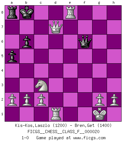 Last move : 1-0 2006 December 28 21:19:31 [Event "FICGS__CHESS__CLASS_F__000020"] [Site "FICGS"] [Date "2006.12.05"] [Round "1"] [White "Kis-Kos,Laszlo"] [Black "Bren,Get"] [Result "1-0"] [WhiteElo "1200"] [BlackElo "1400"] 1.e4 e5 2.Nf3 Nc6 3.Bc4 Nf6 4.Ng5 d5 5.exd5 Nxd5 6.d4 h6 7.Nxf7 Kxf7 8.Qf3+ Ke6 9.Nc3 Nxd4 10.Bxd5+ Kd6 11.Qe4 Bd7 12.O-O c6 13.Re1 cxd5 14.Qxe5+ Kc6 15.Qxd5+ Kc7 16.Bf4+ Kc8 17.Qxd4 g5 18.Qxh8 gxf4 19.Rad1 Kc7 20.Qe5+ Kc8 21.Qxf4 Bc5 22.Qxh6 Bf8 23.Qh8 b6 24.Qd4 Bc5 25.Qd5 Kb8 26.Qxd7 Bxf2+ 27.Kxf2 Qf6+ 28.Kg1 a5 29.Re8+ 1-0 Two knights defense : Lolli attack Kingside Castling by player White (move 12) Player White won this chess game. Follow this game move after move (download)I have never in my life played the French Defence, which is the dullest of all openings. (Wilhelm Steinitz) Habe Mut, dich deines eigenen Verstandes zu bedienen. (Immanuel Kant) Si yo gano un torneo, yo lo gano por mí mismo. Yo hago las jugadas. Nadie me ayuda. (Bobby Fischer) J'ai toujours senti une vague pitié pour l'homme qui ne connaît rien aux échecs, tout comme j'en aurais pour un homme ignorant de l'amour. Les Echecs, comme la musique ou comme l'amour, ont le pouvoir de rendre heureux. (Siegbert Tarrasch) If we knew what we were doing, we would not call it research. (Albert Einstein)