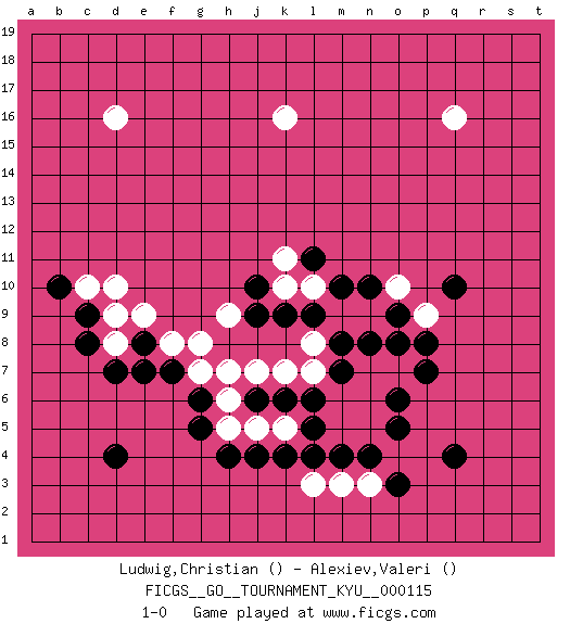 Last move : 1-0 2011 April 26 4:20:37 [Event "FICGS__GO__TOURNAMENT_KYU__000115"] [Site "FICGS"] [Date "2011.01.08"] [Round "1"] [Black "Ludwig,Christian"] [White "Alexiev,Valeri"] [Result "1-0"] 1.d4 q16 2.q4 d16 3.q10 k16 4.k4 d10 5.d7 d8 6.e8 f8 7.f7 e9 8.e7 g8 9.c8 d9 10.c9 c10 11.b10 g7 12.g6 h6 13.g5 h5 14.h4 j5 15.j4 k5 16.l5 m5 17.l6 l7 18.m4 m6 19.k6 k7 20.j6 h7 21.m7 l3 22.l4 m3 23.n4 n5 24.o5 n6 25.o6 n7 26.m8 l8 27.n8 o7 28.p7 o8 29.o9 n3 30.o3 n9 31.p8 o10 32.j9 j7 33.l9 m9 34.l11 l10 35.k9 k10 36.j10 p9 37.o8 h9 38.m10 k11 39.n10 1-0 This go game has been lost on time (started : 2011.01.08 19:46:43) Here are the names of the openings (joseki) played in the four corners : Corner q16 : q16 l11 Hoshi (Hwajeom, Seongjeom, Xingwei`) 4-4 Point. The star or hoshi (4-4) point, emphasizing influence at the potential expense of territory. Player Black won this Go (weiqi, baduk) game. Follow this game move after move (download)Against three in a row, play right in the center. (Anonymous) Looking at the proliferation of personal web pages on the Net, it looks like very soon everyone on Earth will have 15 megabytes of fame. (M.G. Sriram)