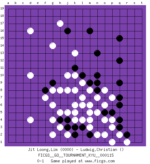 Last move : 0-1 2011 May 7 5:37:28 [Event "FICGS__GO__TOURNAMENT_KYU__000115"] [Site "FICGS"] [Date "2011.01.08"] [Round "1"] [Black "Jit Loong,Lim"] [White "Ludwig,Christian"] [Result "0-1"] [Rating 1 "0000"] 1.q6 d16 2.j16 d4 3.q12 m4 4.h4 h5 5.q15 d10 6.m16 p4 7.q9 k10 8.n13 k13 9.k7 k6 10.n10 l7 11.j7 g14 12.m7 m6 13.l8 l6 14.l5 k4 15.j6 j5 16.m5 n5 17.n6 k5 18.j4 g4 19.h6 g6 20.k3 h3 21.j3 j8 22.l3 l4 23.n4 m3 24.m2 n2 25.o5 m5 26.n3 o4 27.o3 o2 28.p2 p3 29.q3 o6 30.p5 n7 31.o7 m8 32.m9 l9 33.l10 k8 34.h7 h8 35.g7 f7 36.f8 g8 37.g9 q2 38.q1 p1 39.r2 r1 40.q4 j2 41.k2 g2 42.n8 o8 43.n9 p7 44.q7 h17 45.k11 j10 0-1 This go game has been lost on time (started : 2011.01.08 19:46:43) Here are the names of the openings (joseki) played in the four corners : Corner d16 : d16 j16 Hoshi (Hwajeom, Seongjeom, Xingwei`) 4-4 Point. The star or hoshi (4-4) point, emphasizing influence at the potential expense of territory. Corner q4 : q6 m4 Ootakamoku (Chaogao) 6-4 Point. The large takamoku (high) point (6-4), experimented with during the "new fuseki" movement in Japan in the 1930's. This point is seldom played as the initial corner point nowadays. Corner d4 : d4 h4 Hoshi (Hwajeom, Seongjeom, Xingwei`) 4-4 Point. The star or hoshi (4-4) point, emphasizing influence at the potential expense of territory. Player White won this Go (weiqi, baduk) game. Follow this game move after move (download)Grab the border points between two moyos. (Anonymous) He who defends everything defends nothing. (Frederick the Great)