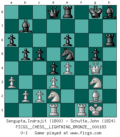 Last move : 0-1 2011 January 9 14:47:15 [Event "FICGS__CHESS__LIGHTNING_BRONZE__000183"] [Site "FICGS"] [Date "2011.01.09"] [Round "1"] [White "Sengupta,Indrajit"] [Black "Schutte,John"] [Result "0-1"] [WhiteElo "1800"] [BlackElo "1824"] 1.e4 c5 2.Nc3 d6 3.g3 Nc6 4.Bg2 g6 5.h3 Bg7 6.Nge2 e6 7.O-O Nge7 8.d3 O-O 9.Bf4 a6 10.a3 b5 11.Qd2 Re8 12.Bh6 Bh8 13.h4 Bb7 14.h5 Ne5 15.Bg5 Qc7 16.f4 Nd7 17.hxg6 hxg6 18.g4 d5 19.f5 d4 20.fxe6 fxe6 21.Na2 Nc6 22.Bh6 Nce5 23.Qf4 Re7 24.Rad1 Rh7 25.Nac1 Re8 26.g5 Qd8 27.Nb3 Nf7 28.Nd2 Nxh6 29.gxh6 g5 30.Qg4 Rxh6 31.Ng3 Ne5 0-1 Sicilian : Closed Kingside Castling by player White (move 7) Kingside Castling by player Black (move 8) Player Black won this chess game. Follow this game move after move (download)If you aren't afraid of Spassky, then I have removed the element of money. (Jim Slater) Wenn Du einsam bist, wenn Du Dich in der Welt wie ein Fremder fühlst, spiele Schach. Das wird Deinen Geist erheben und Dein Ratgeber im Kampf sein. (Aristoteles) La pasion por jugar al Ajedrez es una de las mas inexplicables en el mundo. (H.G. Wells) Je fais ceci parce que dans cinquante coups j'obtiendrai cela; je m'appelle Mikhail Moisevitch Botvinnik. (Botvinnik) Watch your thoughts; they become words. Watch your words; they become actions. Watch your actions; they become habits. Watch your habits; they become character. Watch your character; it becomes your destiny. (Frank Outlaw)