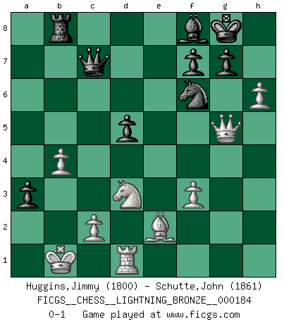 Last move : 0-1 2011 January 9 15:54:29 [Event "FICGS__CHESS__LIGHTNING_BRONZE__000184"] [Site "FICGS"] [Date "2011.01.09"] [Round "1"] [White "Huggins,Jimmy"] [Black "Schutte,John"] [Result "0-1"] [WhiteElo "1800"] [BlackElo "1861"] 1.e4 c5 2.Nf3 d6 3.d4 cxd4 4.Nxd4 Nf6 5.Nc3 a6 6.f3 e5 7.Nb3 Be6 8.Be3 Be7 9.h4 O-O 10.h5 b5 11.a4 b4 12.Nd5 Bxd5 13.exd5 Nbd7 14.Qd2 Nb6 15.Bxb6 Qxb6 16.O-O-O h6 17.Kb1 Rfe8 18.Rh4 Nxd5 19.Re4 Nf6 20.Rxb4 Qc7 21.a5 d5 22.Rb6 Reb8 23.Qe2 Rxb6 24.axb6 Qb8 25.b7 Qxb7 26.Qxe5 Bb4 27.g4 a5 28.g5 hxg5 29.h6 a4 30.Nc1 Ba3 31.Nd3 Bf8 32.Qxg5 a3 33.b4 Rb8 34.Be2 Qc7 0-1 Sicilian : Najdorf Kingside Castling by player Black (move 9) Queenside Castling by player White (move 16) Player Black won this chess game. Follow this game move after move (download)I have never in my life played the French Defence, which is the dullest of all openings. (Wilhelm Steinitz) Der beste Spieler in einem Turnier gewinnt es nie. Er landet auf Platz zwei oder drei. (Siegbert Tarrasch) ¿Que sería del Ajedrez sin errores graciosos?. (Kurt Richter) On entre au jeu d'Echecs comme on entre en Religion. Pour le joueur d'Echecs, la partie d'Echecs c'est l'office, la messe, le défilé du 1er Mai, le dépôt de gerbe au Monument aux Morts. C'est un drame sacré. (Michel Roos) Optimism is a variety of information deficit. Sometimes especially true for correspondence chess games. (Michael Aigner)
