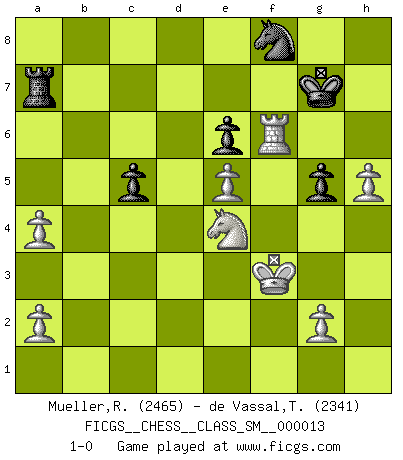 Last move : 1-0 2011 December 1 19:35:35 [Event "FICGS__CHESS__CLASS_SM__000013"] [Site "FICGS"] [Date "2011.01.09"] [Round "1"] [White "Mueller,Robert"] [Black "de Vassal,Thibault"] [Result "1-0"] [WhiteElo "2465"] [BlackElo "2341"] 1.e4 e6 2.Nc3 d5 3.d4 Nf6 4.e5 Nfd7 5.f4 c5 6.Nf3 Nc6 7.Be3 cxd4 8.Nxd4 Bc5 9.Qd2 Nxd4 10.Bxd4 Bxd4 11.Qxd4 Qb6 12.Nb5 Qxd4 13.Nxd4 Ke7 14.h4 Nc5 15.Bd3 Bd7 16.h5 Raf8 17.Kd2 f6 18.Ke3 fxe5 19.fxe5 a6 20.Rh4 Be8 21.Rah1 Rfg8 22.Rg4 Bf7 23.b3 Nd7 24.Nf3 h6 25.Rh3 a5 26.Ra4 b6 27.Rg4 Kd8 28.Bg6 Ke7 29.Bxf7 Kxf7 30.Rhg3 Rh7 31.c4 dxc4 32.Rxc4 g5 33.Rc7 Rd8 34.Nh2 Kg8 35.Ng4 Kh8 36.Rf3 Rb8 37.Rc6 Re7 38.Kd4 Kh7 39.Ke4 Nf8 40.Rf6 a4 41.bxa4 Ra8 42.Kf3 Kg7 43.Rc4 Rd8 44.Nxh6 Rd5 45.Ng4 Rc5 46.Rxc5 bxc5 47.Nf2 Ra7 48.Ne4 1-0 French defense Player White won this chess game. Follow this game move after move (download)In Chess, as it is played by masters, chance is practically eliminated. (Emanuel Lasker) Ich moechte nie einem Club beitreten, der Leute wie mich als Mitglieder aufnimmt. (Woody Allen) Una clavada es mas poderosa que una espada. (Fred Reinfeld) Vous savez, camarade Pachman, je n'éprouve pas de plaisir à être ministre, je jouerais plutôt aux échecs comme vous, ou alors ferais une révolution au Venezuela. (Che Guevara à Ludek Pachman, 'Checkmate in Prague', 1975) Art disturbs, science reassures. (Georges Braque, Le Jour et la Nuit)