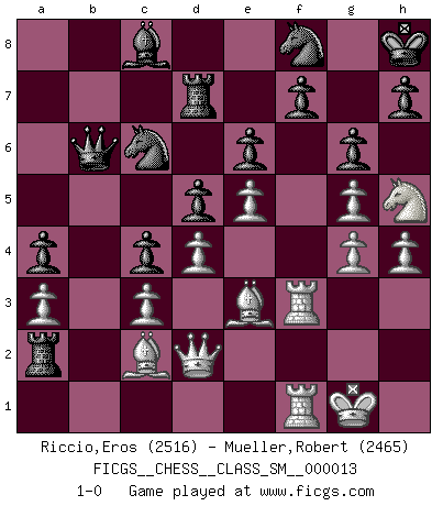 Last move : 1-0 2011 September 1 17:15:16 [Event "FICGS__CHESS__CLASS_SM__000013"] [Site "FICGS"] [Date "2011.01.09"] [Round "1"] [White "Riccio,Eros"] [Black "Mueller,Robert"] [Result "1-0"] [WhiteElo "2516"] [BlackElo "2465"] 1.e4 e6 2.d4 d5 3.Nc3 Nf6 4.e5 Nfd7 5.f4 c5 6.Nf3 Nc6 7.Be3 a6 8.Qd2 Be7 9.Be2 b5 10.O-O O-O 11.Nd1 b4 12.Nf2 Qb6 13.c3 a5 14.Nd3 c4 15.Nf2 Qa7 16.Bd1 a4 17.a3 bxa3 18.bxa3 Rb8 19.Bc2 Rd8 20.g4 Kh8 21.Ng5 Bxg5 22.fxg5 Nf8 23.Nh3 g6 24.Rf3 Rb2 25.Raf1 Rd7 26.Nf4 Ra2 27.h4 Qb6 28.Nh5 1-0 French : Steinitz, Boleslavsky variation Kingside Castling by player White (move 10) Kingside Castling by player Black (move 10) Player White won this chess game. Follow this game move after move (download)Fischer sacrificed virtually everything most of us weakies (to use his term) value, respect, and cherish, for the sake of an artful, often beautiful board game, for the ambivalent privilege of being its greatest master. (Paul Kollar) Das Schachspiel übertrifft alle anderen Spiele so weit wie der Chimborasso einen Misthaufen. (Arthur Schopenhauer) La táctica fluye a partir de una posición superior. (Bobby Fischer) Avec des compensations pour le matériel en plus... (Anonyme) Control your own destiny or someone else will. (Jack Welch)