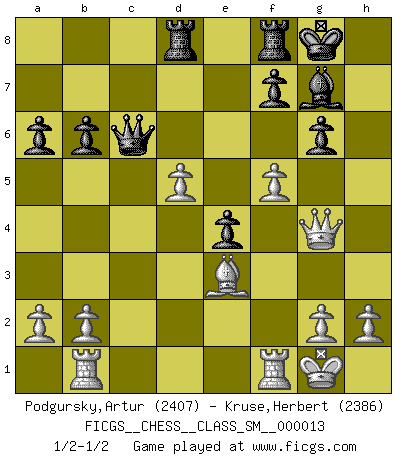 Last move : 1/2-1/2 2011 March 6 4:48:47 [Event "FICGS__CHESS__CLASS_SM__000013"] [Site "FICGS"] [Date "2011.01.09"] [Round "1"] [White "Podgursky,Artur"] [Black "Kruse,Herbert"] [Result "1/2-1/2"] [WhiteElo "2407"] [BlackElo "2386"] 1.e4 c5 2.Nf3 d6 3.d4 cxd4 4.Nxd4 Nf6 5.Nc3 a6 6.Be3 e5 7.Nb3 Be6 8.f3 h5 9.Nd5 Bxd5 10.exd5 Nbd7 11.Qd2 g6 12.Be2 Bg7 13.O-O O-O 14.Na5 Qc7 15.c4 e4 16.f4 Ng4 17.Bxg4 hxg4 18.Rab1 b6 19.Nc6 Nb8 20.f5 Nxc6 21.dxc6 Qxc6 22.Qe2 Rad8 23.Qxg4 d5 24.cxd5 1/2-1/2 Sicilian : Najdorf, Byrne (English) attack Kingside Castling by player White (move 13) Kingside Castling by player Black (move 13) This chess game ended in a draw. Follow this game move after move (download)A player surprised is half beaten. (Proverb) Kasparov ist eine Art Monster mit hundert Augen, denen auch nicht das Geringste entgeht. (Tony Miles) Una de estas pequeñas movidas modestas pudieran ser mas molestas a tu oponente que la amenaza mas grande. (Siegbert Tarrasch) Aidez vos pièces, elles vous aideront. (Paul Morphy) However beautiful the strategy, you should occasionally look at the results. (Winston Churchill)