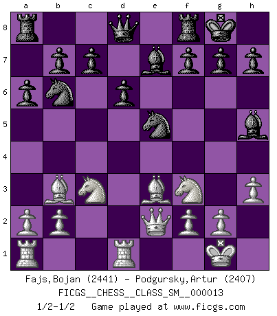 Last move : 1/2-1/2 2011 April 16 17:12:3 [Event "FICGS__CHESS__CLASS_SM__000013"] [Site "FICGS"] [Date "2011.01.09"] [Round "1"] [White "Fajs,Bojan"] [Black "Podgursky,Artur"] [Result "1/2-1/2"] [WhiteElo "2441"] [BlackElo "2407"] 1.e4 e5 2.Nf3 Nc6 3.Bb5 a6 4.Ba4 Nf6 5.d4 exd4 6.O-O Be7 7.Qe2 O-O 8.e5 Nd5 9.Bb3 Nb6 10.c3 dxc3 11.Nxc3 d6 12.Rd1 Bg4 13.h3 Bh5 14.Be3 Nxe5 1/2-1/2 Ruy Lopez : Morphy defense Kingside Castling by player White (move 6) Kingside Castling by player Black (move 7) This chess game ended in a draw. Follow this game move after move (download)You know, comrade Pachman, I don't enjoy being a Minister, I would rather play Chess like you. (Che Guevara) Warum muß ich gegen diesen IDIOTEN verlieren? (Aaron Nimzowitsch) Si el Ajedrez es una ciencia, es la mas inexacta. Si el Ajedrez es un arte, es demasiado inexacto para ser visto como tal. Si el Ajedrez es un deporte, es demasiado esotérico. Si el Ajedrez es un juego, es demasiado exigente para ser solo un juego. Si el Ajedrez es una aventura, es una muy demandante. Si el Ajedrez es una pasión, es una muy gratificante. Si el Ajedrez es la vida, es una muy triste. (Anónimo) Vous m'avez demandé de vous exposer quel est le fondement de la prière. Je ne fais que préparer les pièces du jeu sur la table... Nous sera-t-il permis d'en adopter les règles et si nous les appliquons scrupuleusement nous ne tarderons pas à faire mat le Roi divin ! Il ne pourra échapper à nos mains. (Sainte Thérèse d'Avila, Chemin de perfection) Depression is just anger without enthusiasm. (Unknown)