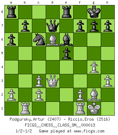 Last move : 1/2-1/2 2011 March 5 22:8:36 [Event "FICGS__CHESS__CLASS_SM__000013"] [Site "FICGS"] [Date "2011.01.09"] [Round "1"] [White "Podgursky,Artur"] [Black "Riccio,Eros"] [Result "1/2-1/2"] [WhiteElo "2407"] [BlackElo "2516"] 1.e4 c5 2.Nf3 d6 3.d4 cxd4 4.Nxd4 Nf6 5.Nc3 a6 6.h3 e6 7.g4 d5 8.exd5 Nxd5 9.Nde2 Bb4 10.Bg2 O-O 11.O-O Bxc3 12.Nxc3 Nxc3 13.bxc3 Qc7 14.Qf3 e5 15.Ba3 Rd8 16.Rab1 Nc6 17.Bc5 Re8 18.Qd3 Be6 19.Bd6 Qd7 1/2-1/2 Sicilian : Najdorf, Adams attack Kingside Castling by player Black (move 10) Kingside Castling by player White (move 11) This chess game ended in a draw. Follow this game move after move (download)Chess is mental torture. (Garry Kasparov) Ohne Leiden bildet sich kein Charakter. (Ernst Freiherr von Feuchtersleben) Yo siempre he tenido un ligero sentimiento de lástima por una persona que no tiene conocimiento del Ajedrez. (Siegbert Tarrasch) Des points faibles ou des trous dans la position de l'adversaire doivent être occupés par des pièces et non pas par des pions. (Siegbert Tarrasch) As a goal marker shodan is important. As a destination it is a poor place to stop. (Thomas Tamayo)
