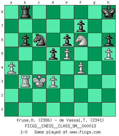 Last move : 1-0 2011 June 22 16:20:32 [Event "FICGS__CHESS__CLASS_SM__000013"] [Site "FICGS"] [Date "2011.01.09"] [Round "1"] [White "Kruse,Herbert"] [Black "de Vassal,Thibault"] [Result "1-0"] [WhiteElo "2386"] [BlackElo "2341"] 1.e4 e6 2.d4 d5 3.Nc3 Nf6 4.Bg5 Be7 5.e5 Nfd7 6.h4 c5 7.Bxe7 Kxe7 8.f4 cxd4 9.Qxd4 Qb6 10.Qxb6 Nxb6 11.Nf3 Nc6 12.h5 h6 13.g4 Bd7 14.O-O-O Rac8 15.Kb1 Rhg8 16.Bd3 Nb4 17.Be2 a6 18.a3 Nc6 19.Bd3 Rcf8 20.Ne2 Na4 21.g5 Nc5 22.Rdg1 Rc8 23.Rg2 Nxd3 24.cxd3 Kf8 25.gxh6 gxh6 26.Rxg8+ Kxg8 27.Nh2 Ne7 28.Nd4 Bb5 29.Nxb5 axb5 30.Ng4 Nf5 31.Ka2 b4 32.Nf6+ Kg7 33.Rg1+ Kh8 34.Kb3 bxa3 35.bxa3 Nd4+ 36.Kb4 Ne2 37.Rf1 Rc6 38.a4 Rb6+ 39.Ka3 Ra6 40.Rf2 Nd4 41.Rg2 Ra8 42.Kb4 b6 43.Rb2 Rb8 44.Kc3 Nc6 45.Rb3 1-0 French : Albin-Alekhine-Chatard attack, Breyer variation Queenside Castling by player White (move 14) Player White won this chess game. Follow this game move after move (download)In the perfect Chess combination as in a first-rate short story, the whole plot and counter-plot should lead up to a striking finale, the interest not being allayed until the very last moment. (Yates and Winter) Der Schachmeister von Heute braucht Courage, einen Killerinstinkt, Ausdauer und Arroganz. (Larry Evans) Muchos jugadores de Ajedrez se sorprendían cuando después de la partida, Fischer explicaba con calma: 'Yo ya había analizado esta posibilidad' en una posición en la cual yo creía que no era posible de prever desde la apertura. (Mikhail Tal) Un journaliste : 'Vous préférez avoir une dame de plus sur l'échiquier ou au lit ?' Boris Spassky : 'Ca dépend de la position.' Without enthusiasm, virtue functions not at all, and vice only poorly. (Mignon McLaughlin, The Neurotic's Notebook, 1960)