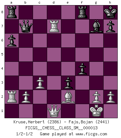 Last move : 1/2-1/2 2011 June 26 12:6:11 [Event "FICGS__CHESS__CLASS_SM__000013"] [Site "FICGS"] [Date "2011.01.09"] [Round "1"] [White "Kruse,Herbert"] [Black "Fajs,Bojan"] [Result "1/2-1/2"] [WhiteElo "2386"] [BlackElo "2441"] 1.e4 c5 2.Nf3 Nc6 3.d4 cxd4 4.Nxd4 Nf6 5.Nc3 e5 6.Ndb5 d6 7.Bg5 a6 8.Na3 b5 9.Bxf6 gxf6 10.Nd5 f5 11.Bd3 Be6 12.O-O Bxd5 13.exd5 Ne7 14.Re1 Bg7 15.c3 O-O 16.Nc2 Qc8 17.a4 e4 18.Bf1 bxa4 19.Ne3 Qb7 20.Ra2 f4 21.Nc4 Qxd5 22.Qc2 f5 23.Rd1 Qc5 24.Nxd6 Kh8 25.Qxa4 e3 26.fxe3 fxe3 27.Be2 Nd5 28.Nb7 Qc7 29.Rxd5 Qxb7 30.Qd1 f4 31.Rd7 1/2-1/2 Sicilian : Pelikan (Lasker/Sveshnikov) variation Kingside Castling by player White (move 12) Kingside Castling by player Black (move 15) This chess game ended in a draw. Follow this game move after move (download)Chess is a forcing house where the fruits of character can ripen more fully than in life. (Edward Morgan Foster) Die Neutralität betrachte ich als eine schwere Krankheit. (Viktor Kortschnoi) Debemos de asegurarnos de que el Ajedrez no se convierta en un lenguaje muerto, muy interesante, pero tan solo para un grupo muy pequeño. (Sytze Faber) Il n'y a pas de prix trop élevé au scalp de l'ennemi. (Koblentz) The Internet is the first thing that humanity has build that humanity doesn't understand, the largest experiment in anarchy that we have ever had. (Eric Schmidt)