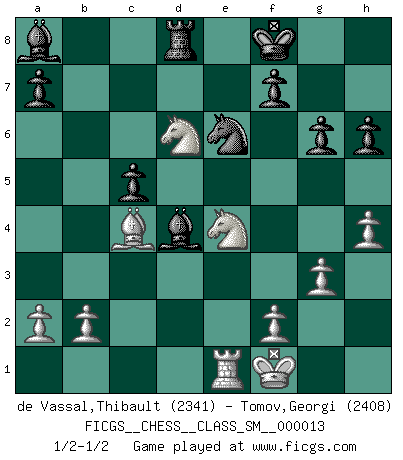 Last move : 1/2-1/2 2011 May 22 16:42:58 [Event "FICGS__CHESS__CLASS_SM__000013"] [Site "FICGS"] [Date "2011.01.09"] [Round "1"] [White "de Vassal,Thibault"] [Black "Tomov,Georgi"] [Result "1/2-1/2"] [WhiteElo "2341"] [BlackElo "2408"] 1.d4 Nf6 2.c4 e6 3.Nf3 d5 4.Nc3 Be7 5.Bg5 h6 6.Bxf6 Bxf6 7.e3 O-O 8.Rc1 c6 9.Bd3 Nd7 10.O-O dxc4 11.Bxc4 e5 12.Bb3 exd4 13.exd4 Re8 14.Qd2 Nf8 15.d5 Ng6 16.dxc6 bxc6 17.Rfe1 Rxe1+ 18.Rxe1 Qxd2 19.Re8+ Nf8 20.Nxd2 Bb7 21.Re1 Rd8 22.Nce4 Bd4 23.Nc4 Ne6 24.Ncd6 Ba8 25.Bc4 Kf8 26.Kf1 g6 27.h4 c5 28.g3 1/2-1/2 Queen's pawn game Kingside Castling by player Black (move 7) Kingside Castling by player White (move 10) This chess game ended in a draw. Follow this game move after move (download)Personally, I rather look forward to a computer program winning the world Chess Championship. Humanity needs a lesson in humility. (Richard Dawkings) Unter Putin wird alles Geld aus Russland wie von einem Staubsauger nach Moskau umgeleitet, das ist wie ein schwarzes Loch. (Garry Kasparov) El Peón aislado arroja penumbra sobre todo el tablero. (Aaron Nimzovich) Lorsque vous vous retrouvez devant une position atroce, ne tendez pas un ultime piège dérisoire avec l'intention d'abandonner si l'adversaire le déjoue ! Faites-vous plutôt un devoir de résister comme si votre vie en dépendait. Jouez le coup qui vous déplairait au centuple si vous étiez dans la peau de votre tortionnaire ! Go and wake up your luck. (Persian saying)