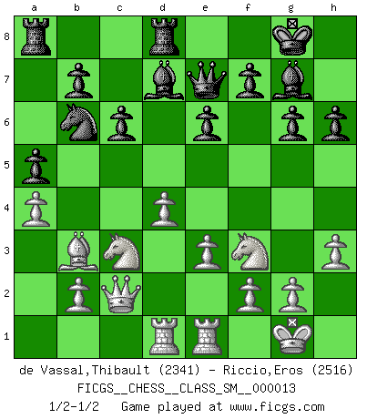 Last move : 1/2-1/2 2011 April 16 12:55:58 [Event "FICGS__CHESS__CLASS_SM__000013"] [Site "FICGS"] [Date "2011.01.09"] [Round "1"] [White "de Vassal,Thibault"] [Black "Riccio,Eros"] [Result "1/2-1/2"] [WhiteElo "2341"] [BlackElo "2516"] 1.c4 e6 2.d4 d5 3.Nf3 Nf6 4.Nc3 c6 5.Bg5 h6 6.Bxf6 Qxf6 7.e3 Nd7 8.Qc2 g6 9.a4 Bg7 10.Bd3 Qe7 11.O-O dxc4 12.Bxc4 a5 13.Rfe1 O-O 14.Rad1 Rd8 15.h3 Nb6 16.Bb3 Bd7 1/2-1/2 English Opening Kingside Castling by player White (move 11) Kingside Castling by player Black (move 13) This chess game ended in a draw. Follow this game move after move (download)Becoming successful at Chess allows you to discover your own personality. That's what I want for the kids I teach. (Saudin Robovic) Kleine Schachspieler machen Mist, und große Schachspieler machen Mist, aber große machen weniger Mist. (Fritz Sämisch) Nada excita más a Grandes Maestros aburridos que una novedad teórica. (Dominic Lawson) Dans le domaine de la peinture, de la gravure et de la sculpture, dès la première décennie de notre siècle, les artistes abandonnent la représentation de la partie d'échecs pour se concentrer sur les pièces, sur les échiquiers et sur toutes les variations auxquelles les unes et les autres peuvent donner lieu. On passe en quelque sorte d'un thème social à un thème musical (au sens de la musica médiévale, c'est-à-dire d'une notion qui inclue le rythme, l'harmonie, la construction et la déconstruction, etc.). Graphiquement et picturalement, l'échiquier apparaît comme une structure ouverte, dynamique, d'une richesse infinie, autorisant toutes les combinatoires et débouchant sur des mouvements et des rythmes de nature exponentielle. (Michel Pastoureau) When it is a question of money, everybody is of the same religion. (Voltaire)