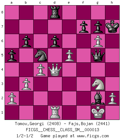 Last move : 1/2-1/2 2011 December 29 11:19:19 [Event "FICGS__CHESS__CLASS_SM__000013"] [Site "FICGS"] [Date "2011.01.09"] [Round "1"] [White "Tomov,Georgi"] [Black "Fajs,Bojan"] [Result "1/2-1/2"] [WhiteElo "2408"] [BlackElo "2441"] 1.Nf3 Nf6 2.c4 b6 3.g3 e6 4.Bg2 Bb7 5.d4 Be7 6.Nc3 Ne4 7.Bd2 O-O 8.d5 Nxd2 9.Qxd2 Bb4 10.Rd1 d6 11.O-O Nd7 12.Ne1 Bxc3 13.Qxc3 e5 14.e4 a5 15.f4 Qe7 16.Nd3 exf4 17.gxf4 c6 18.dxc6 Bxc6 19.Nf2 Rfe8 20.Rd3 Nc5 21.Rg3 Qf8 22.Ng4 Kh8 23.Nf6 Re6 24.Nh5 Rg6 25.Rxg6 hxg6 26.Ng3 Rd8 27.b3 Kh7 28.Qd4 Qe7 29.Rd1 Qh4 30.f5 Qg5 31.e5 Bxg2 32.fxg6+ 1/2-1/2 Reti Opening Kingside Castling by player Black (move 7) Kingside Castling by player White (move 11) This chess game ended in a draw. Follow this game move after move (download)Chess, like love, is infectious at any age. (Flohr) Sie bekommen vielleicht den Eindruck, dass die Spitzenspieler überhaupt gar nicht so stark sind. Aber das stimmt nicht. Es ist eine Illusion. Mit einem Computer an der Seite ist es sehr leicht, Urteile zu fällen, aber wenn man alleine am Brett sitzt, sieht die Sache ganz anders aus. (Vladimir Kramnik) Solo existe una cosa que Fischer hace en el Ajedrez sin placer: ¡perder!. (Boris Spassky) Je fais ceci parce que dans cinquante coups j'obtiendrai cela; je m'appelle Mikhail Moisevitch Botvinnik. (Botvinnik) Knowledge will give you power, but character respect. (Bruce Lee)