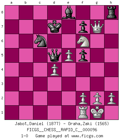 Last move : 1-0 2011 March 24 12:39:35 [Event "FICGS__CHESS__RAPID_C__000096"] [Site "FICGS"] [Date "2011.01.11"] [Round "1"] [White "Jabot,Daniel"] [Black "Oraha,Zaki"] [Result "1-0"] [WhiteElo "1877"] [BlackElo "1565"] 1.e4 e6 2.d4 d5 3.e5 c5 4.c3 Nc6 5.Nf3 Bd7 6.a3 a5 7.Bd3 c4 8.Bc2 b5 9.O-O b4 10.axb4 axb4 11.Rxa8 Qxa8 12.b3 cxb3 13.Bxb3 bxc3 14.Nxc3 Nge7 15.Nb5 Kd8 16.Ng5 Be8 17.Nd6 Rg8 18.Nxh7 Nf5 19.Nxf5 exf5 20.Bg5+ Be7 21.Bxd5 Rh8 22.Bxe7+ Kxe7 23.Qh5 Qa5 24.Qg5+ Kd7 25.Qxg7 Qxd5 26.Nf6+ 1-0 This chess game has been lost on time (started : 2011.01.11 12:47:22) French : Advance, Euwe variation Kingside Castling by player White (move 9) Player White won this chess game. Follow this game move after move (download)Openings teach you openings. Endgames teach you chess ! (Stephan Gerzadowicz) Schach ist die gewalttätigste aller Sportarten. (Garry Kasparov) Aún el Rey más flojo huye despavorido ante la amenaza de un Jaque doble. (Aaron Nimzowitsch) La victoire dans une partie d'Echecs appartient la plupart du temps à celui qui voit un peu plus loin que l'adversaire. (Lasker) Real knowledge is to know the extent of one's ignorance. (Confucius)