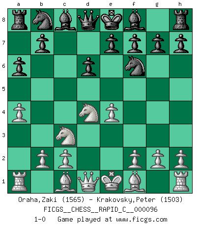 Last move : 1-0 2011 February 21 10:53:55 [Event "FICGS__CHESS__RAPID_C__000096"] [Site "FICGS"] [Date "2011.01.11"] [Round "1"] [White "Oraha,Zaki"] [Black "Krakovsky,Peter"] [Result "1-0"] [WhiteElo "1565"] [BlackElo "1503"] 1.e4 c5 2.Nf3 d6 3.d4 cxd4 4.Nxd4 Nf6 5.Nc3 a6 6.a4 1-0 This chess game has been lost on time (started : 2011.01.11 12:47:22) Sicilian : Najdorf Player White won this chess game. Follow this game move after move (download)Help your pieces so they can help you. (Paul Morphy) Kritik überlasse ich den Spießern. Ich zeige nichts, wofür ich mich schämen muss. (Alexandra Kosteniuk) Cuando tengas duda... ¡juega al Ajedrez!. (Tevis) Aux échecs, les retours au sommet sont rares : les dommages psychologiques consécutifs à une défaite sont trop sévères. (Daily Telegraph) See no evil, hear no evil, speak no evil. (The 3 monkeys)
