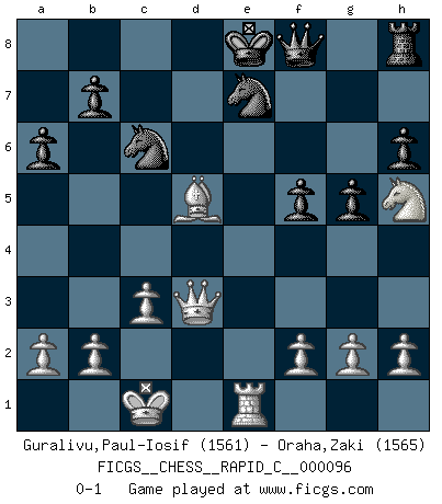 Last move : 0-1 2011 March 17 11:49:15 [Event "FICGS__CHESS__RAPID_C__000096"] [Site "FICGS"] [Date "2011.01.11"] [Round "1"] [White "Guralivu,Paul-Iosif"] [Black "Oraha,Zaki"] [Result "0-1"] [WhiteElo "1561"] [BlackElo "1565"] 1.e4 e6 2.d4 d5 3.Nc3 Bb4 4.Nge2 dxe4 5.Bd2 f5 6.Nxe4 Be7 7.N4g3 Bf6 8.c3 Ne7 9.Nf4 e5 10.dxe5 Bxe5 11.Bc4 Qd6 12.Qf3 Nbc6 13.O-O-O Bd7 14.Be3 Qf6 15.Ngh5 Qf8 16.Ne6 Bxe6 17.Bxe6 Bd6 18.Bg5 h6 19.Bf4 Rd8 20.Rhe1 g5 21.Bxd6 Rxd6 22.Rxd6 cxd6 23.Qd3 d5 24.Bxd5 a6 0-1 French : Winawer (Nimzovich) variation Queenside Castling by player White (move 13) Player Black won this chess game. Follow this game move after move (download)If cunning alone were needed to excel, women would be the best Chess players. (Albin) Es gibt nur zwei wahre Schachgenies - das andere war Wilhelm Steinitz, der Weltmeister von 1872 bis 1894. (Robert James Fischer) Bobby Fischer es el jugador de Ajedrez mas grande que jamás haya existido. (Ken Smith) Le pion, dans sa simplicité, marche droit devant lui, mais lorsqu'il prend, il le fait obliquement? Ainsi l'homme, tant qu'il reste pauvre, marche dans la droiture et vit honnêtement, mais lorsqu'il recherche les honneurs, il flatte, se parjure et, par les voies obliques, cherche une position supérieure sur l'échiquier du monde. (Jean de Galles) God, you are such an idiot. - Actually, I thought I was more of a jerk. (Gregory House to Stacy Warner, House M.D.)