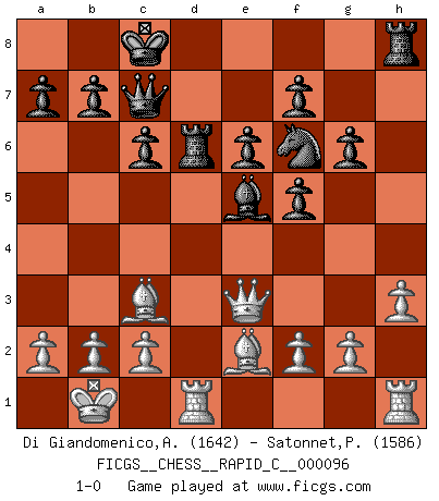 Last move : 1-0 2011 May 10 18:0:17 [Event "FICGS__CHESS__RAPID_C__000096"] [Site "FICGS"] [Date "2011.01.11"] [Round "1"] [White "Di Giandomenico,Alfonso"] [Black "Satonnet,Patrick"] [Result "1-0"] [WhiteElo "1642"] [BlackElo "1586"] 1.e4 d5 2.exd5 Qxd5 3.Nc3 Qa5 4.d4 Nf6 5.Bd2 c6 6.Nf3 Bf5 7.Be2 e6 8.Nh4 Bg6 9.Nxg6 hxg6 10.Ne4 Qc7 11.Nxf6+ gxf6 12.h3 Bd6 13.Bc3 Nd7 14.Qd3 O-O-O 15.O-O-O f5 16.Kb1 Nf6 17.d5 Be5 18.d6 Rxd6 19.Qe3 1-0 This chess game has been lost on time (started : 2011.01.11 12:47:22) Scandinavian (centre counter) defense Queenside Castling by player Black (move 14) Queenside Castling by player White (move 15) Player White won this chess game. Follow this game move after move (download)When the Chess game is over, the Pawn and the King go back to the same box. (Irish saying) Frage: Wie viele Autos haben Sie schon zerstört? - Antwort: Nur zwei. (Loek van Wely) Ciertamente, de todas la drogas del mundo, el Ajedrez debe ser el mas placentero permamentemente. (Assiac) Plusieurs personnes se sont demandées comment Tal faisait pour gagner... En fait, c'est très simple ! Il met ses pièces au centre de l'échiquier et les sacrifie quelque part ! (David Bronstein) It is not enough to be a good player... you must also play well. (Siegbert Tarrasch)