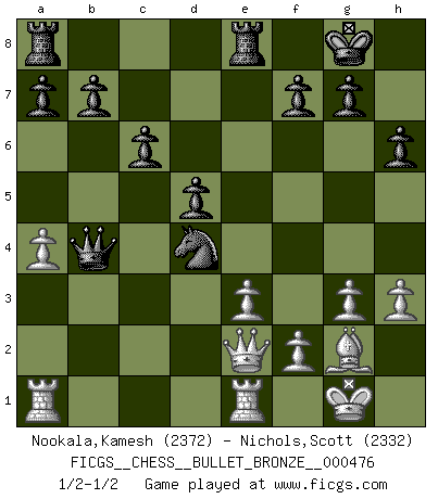 Last move : 1/2-1/2 2011 January 11 16:33:36 [Event "FICGS__CHESS__BULLET_BRONZE__000476"] [Site "FICGS"] [Date "2011.01.11"] [Round "1"] [White "Nookala,Kamesh"] [Black "Nichols,Scott"] [Result "1/2-1/2"] [WhiteElo "2372"] [BlackElo "2332"] 1.b3 d5 2.Bb2 Nf6 3.g3 c6 4.Nf3 Bf5 5.Bg2 e6 6.O-O Be7 7.Nh4 Bg4 8.h3 Bh5 9.c4 O-O 10.d3 Nbd7 11.Nd2 h6 12.a3 Re8 13.Re1 Nh7 14.cxd5 exd5 15.Ndf3 Bf6 16.Qc2 Bxb2 17.Qxb2 Bxf3 18.Nxf3 Qf6 19.Qd2 Nhf8 20.e3 Ne5 21.Nxe5 Qxe5 22.b4 Qd6 23.a4 Ne6 24.Qe2 Qxb4 25.d4 Nxd4 1/2-1/2 Nimzovich-Larsen attack : Classical variation Kingside Castling by player White (move 6) Kingside Castling by player Black (move 9) This chess game ended in a draw. Follow this game move after move (download)Let the perfectionist play postal. (Yasser Seirawan) Man wirke der falschen Auffassung entgegen, als ob jeder Zug Unmittelbares zu leisten habe; auch Werte- und Ruhezüge haben ihre Existenzberechtigung. (Aaron Nimzowitsch) No puedes jugar al Ajedrez si eres de corazón noble. (Proverbio Francés) On est toujours la mazette de quelqu'un d'autre. (Anonyme) Convictions are more dangerous enemies of truth than lies. (Friedrich Nietzsche)