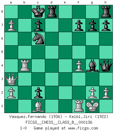 Last move : 1-0 2011 July 1 21:25:35 [Event "FICGS__CHESS__CLASS_B__000136"] [Site "FICGS"] [Date "2011.01.11"] [Round "1"] [White "Vasquez,Fernando"] [Black "Kelbl,Jiri"] [Result "1-0"] [WhiteElo "1936"] [BlackElo "1922"] 1.e4 e5 2.Nf3 Nc6 3.d4 exd4 4.Nxd4 Qh4 5.Nc3 Bb4 6.Be2 Nge7 7.O-O Bxc3 8.bxc3 a6 9.f4 d6 10.e5 Nf5 11.Nxf5 Bxf5 12.Rb1 O-O-O 13.Qd5 dxe5 14.Qb3 b5 15.Qa3 Nb8 16.c4 Bg4 17.Bd3 e4 18.cxb5 exd3 19.bxa6 dxc2 20.Rb4 Nc6 21.a7 1-0 Scotch : Steinitz variation Kingside Castling by player White (move 7) Queenside Castling by player Black (move 12) Player White won this chess game. Follow this game move after move (download)It is the aim of the modern school, not to treat every position according to one general law, but according to the principle inherent in the position. (Richard Reti) Darum geht es im Schach. Einen Tag gibst du deinem Gegner eine Lektion, am nächsten Tag gibt er dir eine. (Robert James Fischer) Fischer deseaba darle a los Rusos una sopa de su propia medicina. (Larry Evans) Le moment que je préfère le plus dans une rencontre, c'est celui où je sens que la personnalité de l'adversaire se brise. (Robert Fischer) It's not the size of the dog in the fight, it's the size of the fight in the dog. (Mark Twain)