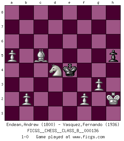 Last move : 1-0 2011 December 13 21:1:27 [Event "FICGS__CHESS__CLASS_B__000136"] [Site "FICGS"] [Date "2011.01.11"] [Round "1"] [White "Endean,Andrew"] [Black "Vasquez,Fernando"] [Result "1-0"] [WhiteElo "1800"] [BlackElo "1936"] 1.d4 d5 2.c4 dxc4 3.Nf3 Nf6 4.e3 Be6 5.Nc3 c6 6.Ng5 Qd7 7.Be2 g6 8.O-O Bg7 9.e4 O-O 10.Be3 b5 11.Nxe6 Qxe6 12.e5 Nd5 13.a4 b4 14.Ne4 Nd7 15.Rc1 Rad8 16.Bd2 Nxe5 17.dxe5 Qxe5 18.Rxc4 Nb6 19.Rxb4 c5 20.Rxb6 axb6 21.Nc3 Bh6 22.Bxh6 Rxd1 23.Rxd1 Rb8 24.g3 Qf6 25.h4 Qf5 26.Kg2 Kh8 27.Bf3 f6 28.Rd2 Re8 29.Nd5 g5 30.Nxe7 Qe5 31.Nc6 Qc7 32.hxg5 fxg5 33.Bxg5 Qg7 34.Bf4 Qf6 35.Rd6 Re6 36.Rd8+ Kg7 37.Bd5 h5 38.Bd2 Qf5 39.Bc3+ Kh6 40.Rh8+ Kg6 41.Bxe6 Qe4+ 42.Kh2 Qxe6 43.Ne5+ Kg7 44.Nf3 Kg6 45.Rf8 Kh6 46.Rf6+ Qxf6 47.Bxf6 Kg6 48.Bd8 Kf7 49.Bxb6 Ke6 50.Bxc5 Kf5 51.a5 Ke4 52.Nd4 1-0 QGA, Flohr variation Kingside Castling by player White (move 8) Kingside Castling by player Black (move 9) 10 pieces endgame at move 49 : White KBNPPPP , Black KPP WHITE : King + 1 Bishop 1 Knight 4 Pawns BLACK : King + 2 Pawns 9 pieces endgame at move 50 : White KBNPPPP , Black KP WHITE : King + 1 Bishop 1 Knight 4 Pawns BLACK : King + 1 Pawn Player White won this chess game. Follow this game move after move (download)A bad day of Chess is better than any good day at work. (Anonymous) Ein Buch ist ein Spiegel; wenn ein Affe hineinsieht, so kann kein Apostel heraus gucken. (Georg Christoph Lichtenberg) La esencia del Ajedrez es pensar acerca de lo que el Ajedrez es. (David Bronstein) La tactique, c'est ce que vous faites quand il y a quelque chose à faire; la stratégie, c'est ce que vous faites quand il n'y a rien à faire. (Savielli Tartacower) The Movers & Shakers of this world are those who play chess in the mornings and go to the disco in the evenings. (Dinesh De Silva)