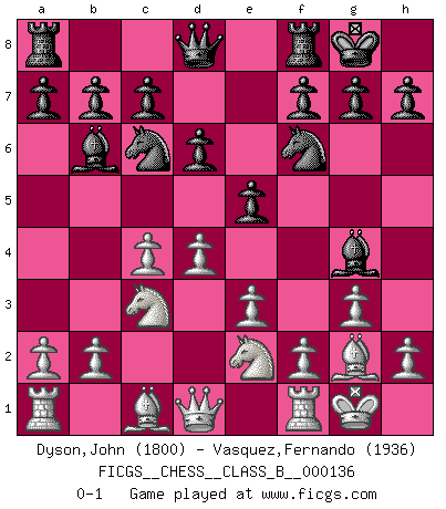 Last move : 0-1 2011 March 29 1:51:26 [Event "FICGS__CHESS__CLASS_B__000136"] [Site "FICGS"] [Date "2011.01.11"] [Round "1"] [White "Dyson,John"] [Black "Vasquez,Fernando"] [Result "0-1"] [WhiteElo "1800"] [BlackElo "1936"] 1.c4 e5 2.g3 Nc6 3.Nc3 Bc5 4.Bg2 Nf6 5.e3 O-O 6.Nge2 d6 7.d4 Bb6 8.O-O Bg4 0-1 This chess game has been lost on time (started : 2011.01.11 21:16:51) English Opening Kingside Castling by player Black (move 5) Kingside Castling by player White (move 8) Player Black won this chess game. Follow this game move after move (download)Via the squares on the chessboard, the Indians explain the movement of time and the age, the higher influences which control the world and the ties which link Chess with the human soul. (Al-Masudi) Ich hatte Zahnschmerzen im ersten Spiel. In der zweiten Partie tat mir der Kopf weh. In der dritten war es eine Rheuma-Attacke und während der vierten fühlte ich mich nicht gut. Und in der fünften? Nun, man muss doch nicht jedes Spiel gewinnen, oder? (Savielly Grigorievitsch Tartakower) Las combinaciones han sido siempre el aspecto más intrigante del Ajedrez. Los Maestros las buscan, el público las aplauden, los críticos las alaban. La razón se debe a que las combinaciones hacen posible que el Ajedrez sea más que un ejercicio matemático con una carencia de vida. Ellas son la poesía del juego, son del Ajedrez lo que la melodía es de la música. Ellas representan el triunfo de la mente sobre la materia. (Reuben Fine) Les Echecs représentent une sphère d'idées créatrices basée sur la volonté des deux protagonistes. (Smyslov) Gambling : The sure way of getting nothing from something. (Wilson Mizner)