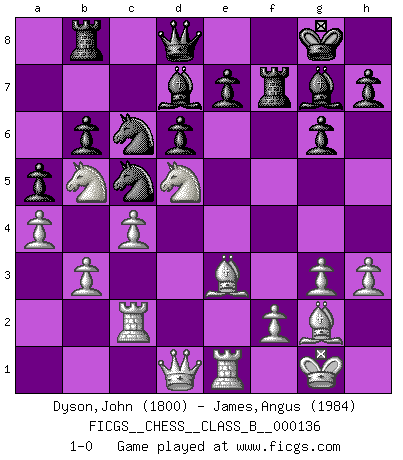 Last move : 1-0 2011 June 7 12:1:33 [Event "FICGS__CHESS__CLASS_B__000136"] [Site "FICGS"] [Date "2011.01.11"] [Round "1"] [White "Dyson,John"] [Black "James,Angus"] [Result "1-0"] [WhiteElo "1800"] [BlackElo "1984"] 1.c4 Nf6 2.g3 g6 3.Bg2 Bg7 4.Nc3 O-O 5.e4 d6 6.Nge2 c5 7.O-O Nc6 8.d3 Rb8 9.h3 a6 10.a4 Bd7 11.Be3 Ne8 12.d4 cxd4 13.Nxd4 Nc7 14.b3 Ne6 15.Nde2 f5 16.exf5 Rxf5 17.Rc1 b6 18.Nd5 a5 19.Re1 Rf8 20.Nec3 Nc5 21.Nb5 Rf7 22.Rc2 1-0 English, 1...Nf6 (Anglo-Indian defense) Kingside Castling by player Black (move 4) Kingside Castling by player White (move 7) Player White won this chess game. Follow this game move after move (download)Chess is played with the mind and not with the hands ! (Renaud and Kahn) Es gibt nur zwei wahre Schachgenies - das andere war Wilhelm Steinitz, der Weltmeister von 1872 bis 1894. (Robert James Fischer) Solo los afeminados hacen el Enroque. (Rob Sillars) Horreur, mais aussi harmonie suprême : qu'y avait-il en effet au monde en dehors des échecs ? Le brouillard, l'inconnu, le non-être... (Vladimir Nabokov) A good player is always lucky. (Capablanca)