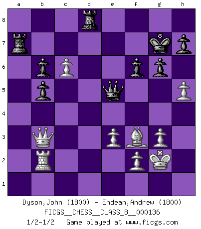 Last move : 1/2-1/2 2011 June 12 13:3:38 [Event "FICGS__CHESS__CLASS_B__000136"] [Site "FICGS"] [Date "2011.01.11"] [Round "1"] [White "Dyson,John"] [Black "Endean,Andrew"] [Result "1/2-1/2"] [WhiteElo "1800"] [BlackElo "1800"] 1.c4 e5 2.g3 Nf6 3.Bg2 d5 4.cxd5 Nxd5 5.Nc3 Nb6 6.Nf3 Nc6 7.O-O Be7 8.a3 O-O 9.b4 Be6 10.Rb1 f6 11.d3 Nd4 12.Nd2 c6 13.e3 Nb5 14.Nxb5 cxb5 15.Nb3 Qd7 16.Nc5 Bxc5 17.bxc5 Na4 18.Bd2 Rac8 19.Bb4 Rfd8 20.d4 Ba2 21.Rc1 Bc4 22.Rxc4 Nb2 23.Qb3 Nxc4 24.a4 a6 25.Bc3 Kh8 26.Rb1 b6 27.c6 Qe8 28.axb5 axb5 29.dxe5 Nxe5 30.Bxe5 Qxe5 31.Bf3 Rc7 32.h4 g6 33.Kg2 Kg7 34.Rb2 Ra7 35.h5 1/2-1/2 English Opening Kingside Castling by player White (move 7) Kingside Castling by player Black (move 8) This chess game ended in a draw. Follow this game move after move (download)A thorough understanding of the typical mating continuations makes the most complicated sacrificial combinations leading up to them not only not difficult, but almost a matter of course. (Siegbert Tarrasch) Zu meiner Zeit war ein 20 jähriger ein junger Spieler, heute ist er ein Veteran. (Garry Kasparov) Aquel que ve no otra dirección en el juego que la de dar Jaque Mate a su oponente, nunca será un buen jugador de Ajedrez. (Euwe) Le thème de l'attaque double intervient d'une manière ou d'une autre dans l'immense majorité des combinaisons. (Youri Averbakh) When you stop learning you start dying. (M. Scott Adams)