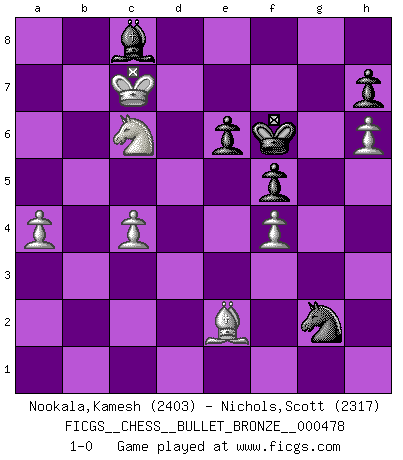 Last move : 1-0 2011 January 12 17:11:43 [Event "FICGS__CHESS__BULLET_BRONZE__000478"] [Site "FICGS"] [Date "2011.01.12"] [Round "1"] [White "Nookala,Kamesh"] [Black "Nichols,Scott"] [Result "1-0"] [WhiteElo "2403"] [BlackElo "2317"] 1.e4 c5 2.Nf3 d6 3.a4 Nf6 4.Bb5+ Nc6 5.e5 dxe5 6.Nxe5 Qd5 7.Nxc6 bxc6 8.Be2 g6 9.O-O Bg7 10.Bf3 Qd6 11.d3 O-O 12.Nd2 Nd7 13.Nc4 Qc7 14.Re1 Nb6 15.Na5 Nd5 16.Nb3 Qd6 17.Nd2 Rb8 18.Ne4 Qc7 19.Nxc5 Rxb2 20.Bxb2 Bxb2 21.c4 Bxa1 22.Qxa1 Nb4 23.Qc3 a5 24.d4 Re8 25.Be4 Rd8 26.h3 Na2 27.Qe3 Nb4 28.Nb3 Be6 29.Qc3 Rb8 30.Bf3 Bf5 31.Re2 Bd3 32.Rb2 Qd8 33.Rd2 Bb1 34.Bd1 Bf5 35.g4 Bc8 36.Re2 Ra8 37.Re4 Na2 38.Qd2 Nb4 39.Kg2 Ra7 40.Re5 f6 41.Re4 Rd7 42.Qe3 Ra7 43.Nc5 Kh8 44.h4 Qf8 45.Bb3 f5 46.Rf4 Qf6 47.g5 Qd6 48.h5 gxh5 49.Rh4 e6 50.Rxh5 Rg7 51.Kf3 Kg8 52.Rh6 Rg6 53.Qf4 Qxf4+ 54.Kxf4 Rxh6 55.gxh6 Kf7 56.Ke5 Ke7 57.f4 Na6 58.Bd1 Nb4 59.Bh5 Nc2 60.Nb3 Nb4 61.Be2 c5 62.Nxa5 cxd4 63.Kxd4 Nc2+ 64.Kc5 Ne1 65.Nc6+ Kf6 66.Kb6 Ng2 67.Kc7 1-0 Thibault de Vassal I love this game, definitely... the opening and knight danse are great :) Sicilian Kingside Castling by player White (move 9) Kingside Castling by player Black (move 11) Player White won this chess game. Follow this game move after move (download)The most important feature of the Chess position is the activity of the pieces. This is absolutely fundamental in all phases of the game: Opening, Middlegame and especially Endgame. The primary constraint on a piece's activity is the Pawn structure. (Michael Stean) Pläne sind die Träume des Verständigen. (Ernst Freiherr von Feuchtersleben) Aquel que toma al Peón de Caballo de la Reina, se pasará la noche a dormir en la calle. (Anónimo) Ce qui est bien, c'est d'avoir tout un tas de pièces en prise : l'adversaire ne peut en prendre qu'une à la fois. Cité par Thierry Audin. To err is human, but to really foul things up requires a computer. (Farmer's Almanac, 1978)