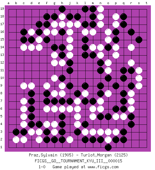 Last move : 1-0 2011 May 2 15:19:4 [Event "FICGS__GO__TOURNAMENT_KYU_III__000015"] [Site "FICGS"] [Date "2011.01.13"] [Round "1"] [Black "Praz,Sylvain"] [White "Turlot,Morgan"] [Result "1-0"] [Rating 1 "1905"] [Rating 2 "2125"] 1.r16 c4 2.q3 d16 3.f17 c14 4.e4 g3 5.c3 d3 6.d4 e3 7.f3 f4 8.f2 c2 9.b3 e2 10.g2 c5 11.d6 b2 12.h3 g4 13.h4 f6 14.d5 c6 15.h5 g6 16.d7 c7 17.d8 c9 18.f8 g8 19.g9 h9 20.g7 h8 21.f7 h6 22.h7 j6 23.j7 k5 24.l4 k7 25.k8 k4 26.k3 l3 27.l2 m3 28.m2 n3 29.n2 o3 30.p2 q5 31.h10 p17 32.l17 r14 33.p16 o16 34.p15 n17 35.q17 p18 36.r11 r12 37.q11 p13 38.q7 o15 39.q18 j17 40.l15 j15 41.l13 m14 42.l14 j13 43.o14 o12 44.n12 n13 45.n11 p14 46.m13 n14 47.f15 g13 48.h14 j14 49.h16 j16 50.h13 h12 51.j12 g12 52.g14 l18 53.k18 k17 54.m18 l16 55.m17 m16 56.j18 h17 57.g18 h18 58.h19 g17 59.f18 f16 60.e16 g16 61.e17 e15 62.d15 e14 63.c16 d14 64.c15 q9 65.r9 r8 66.q8 r7 67.p9 s9 68.q10 s10 69.r5 r6 70.r4 l8 71.l7 k6 72.m7 g10 73.j9 f9 74.j11 d9 75.q6 n6 76.o5 n7 77.n8 s11 78.n5 m5 79.l9 m6 80.s15 n18 81.l19 n19 82.m19 o11 83.o10 o8 84.n9 j2 85.h2 p5 86.p6 p3 87.q2 o2 88.o1 1-0 Here are the names of the openings (joseki) played in the four corners : Corner d16 : d16 f17 Hoshi (Hwajeom, Seongjeom, Xingwei`) 4-4 Point. The star or hoshi (4-4) point, emphasizing influence at the potential expense of territory. Ikken Kakari (Hankan Keolch'im, Yi Gua`jiao~, 1-Space Low Approach). Black 2 is the standard approach move to the 4-4. Corner d4 : c4 e4 Komoku (Somok, Xiao~mu`) 3-4 Point. The komoku (3-4) point is the traditional corner enclosure move.. Ikken Takagakari (Hankan Nop'dakeolch'im, Yi Gaogua`jiao~, 1-Space High Approach). The 5-4 approach move has become more popular in modern times, as modern Go emphasizes speed and influence. Corner q16 : r16 p17 Komoku (Somok, Xiao~mu`) 3-4 Point. The komoku (3-4) point is the traditional corner enclosure move.. Ikken Kakari (Hankan Keolch'im, Yi Gua`jiao~, 1-Space Low Pincer). The small knight move is the basic approach move to the 3-4 point stone. It has been continually used for over four centuries. There are limitless variations, with new moves constantly being discovered. White 2 opens the door to a treaure store of joseki. Player Black won this Go (weiqi, baduk) game. Follow this game move after move (download)Sacrifice for shape. (Anonymous) This is where the fun begins. (Anakin Skywalker in Star Wars ep.3)