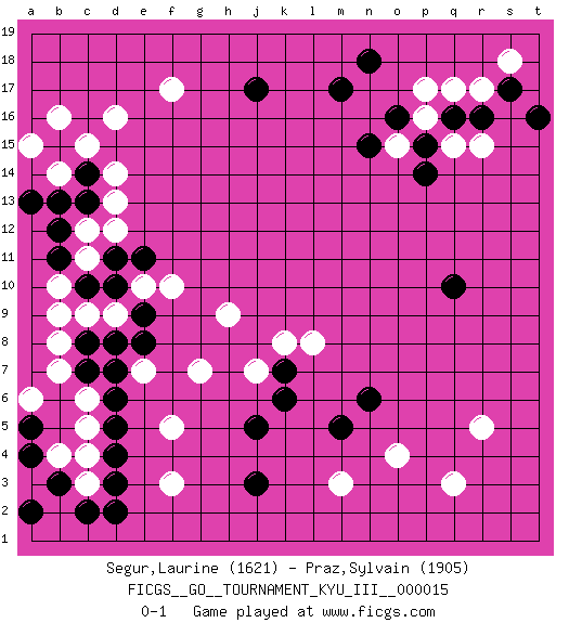 Last move : 0-1 2011 April 16 13:7:36 [Event "FICGS__GO__TOURNAMENT_KYU_III__000015"] [Site "FICGS"] [Date "2011.01.13"] [Round "1"] [Black "Segur,Laurine"] [White "Praz,Sylvain"] [Result "0-1"] [Rating 1 "1621"] [Rating 2 "1905"] 1.d4 q3 2.q16 d16 3.q10 r5 4.m17 r17 5.r16 q17 6.s17 s18 7.t16 p17 8.o16 p16 9.p15 o15 10.n18 q15 11.p14 r15 12.n15 f3 13.j3 f5 14.c7 c3 15.d3 c4 16.d2 c6 17.d5 c5 18.d6 b7 19.d8 b8 20.c10 m3 21.j5 e7 22.d7 g7 23.c2 j7 24.k6 l8 25.k7 k8 26.m5 o4 27.n6 f10 28.c13 f17 29.j17 b16 30.a2 b10 31.b11 c9 32.d10 d9 33.e9 e10 34.c8 b9 35.e8 h9 36.b3 b4 37.a5 a6 38.a4 c11 39.d11 c12 40.b12 d12 41.e11 d13 42.c14 d14 43.b15 c15 44.a13 b14 45.b13 a15 0-1 Here are the names of the openings (joseki) played in the four corners : Corner d4 : d4 f3 Hoshi (Hwajeom, Seongjeom, Xingwei`) 4-4 Point. The star or hoshi (4-4) point, emphasizing influence at the potential expense of territory. Ikken Kakari (Hankan Keolch'im, Yi Gua`jiao~, 1-Space Low Approach). White 2 is the standard approach move to the 4-4. Corner d16 : d16 c13 Hoshi (Hwajeom, Seongjeom, Xingwei`) 4-4 Point. The star or hoshi (4-4) point, emphasizing influence at the potential expense of territory. Niken Kakari (Dukan Keolch'im, E`r Gua`jiao~, 2-Space Low Approach). White typically answers by 7-3 or 3-5 (which is not joseki). Player White won this Go (weiqi, baduk) game. Follow this game move after move (download)Take the cutting stone on the second line. (Anonymous) A belief is an idea the mind possesses, an idea that possesses the mind. (Robert Oxden Bolton)