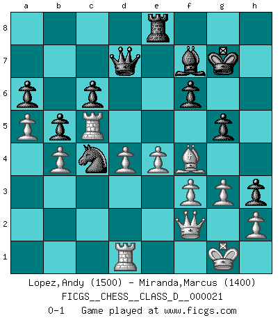 Last move : 0-1 2007 May 31 5:42:20 [Event "FICGS__CHESS__CLASS_D__000021"] [Site "FICGS"] [Date "2006.12.06"] [Round "1"] [White "Lopez,Andy"] [Black "Miranda,Marcus"] [Result "0-1"] [WhiteElo "1500"] [BlackElo "1400"] 1.Nf3 d5 2.d4 Nf6 3.c4 e6 4.Nc3 c6 5.e3 Nbd7 6.Bd3 Be7 7.Bd2 O-O 8.Rc1 b6 9.cxd5 exd5 10.O-O Bb7 11.a3 Rc8 12.Qc2 Re8 13.Ne5 Nf8 14.Bf5 Bd6 15.Bxc8 Qxc8 16.Nf3 Ng6 17.b4 Ne4 18.Rfd1 Nxc3 19.Qxc3 Qb8 20.a4 a6 21.a5 b5 22.Rc2 h5 23.Rdc1 h4 24.Qb3 Rc8 25.Kh1 Rc7 26.Be1 Qc8 27.Bc3 h3 28.g3 Qf5 29.Ne1 Qe4+ 30.Kg1 Bc8 31.Ba1 Bd7 32.Bb2 Nf8 33.Rc3 Nh7 34.f3 Qe7 35.Ba3 Qf6 36.Qb2 Ng5 37.Qf2 Qe7 38.Nd3 f6 39.Nc5 Bxc5 40.Rxc5 Nf7 41.Rxd5 Nd6 42.Rdc5 Nc4 43.Rc3 Qe8 44.e4 Be6 45.Bb2 Re7 46.Bc1 Qd7 47.Bf4 Bf7 48.Rc2 Re8 49.Rc3 Re7 50.Rc1 Re8 51.Re1 g6 52.Rf1 Kg7 53.Rd1 g5 0-1 Reti Opening Kingside Castling by player Black (move 7) Kingside Castling by player White (move 10) Player Black won this chess game. Follow this game move after move (download)For surely of all the drugs in the world, Chess must be the most permanently pleasurable. (Assiac) Gewinnen beim Schach fördert das Selbstvertrauen. Beim Sex spüre ich sowas nicht... (Garry Kasparov) a manera como él juega al Ajedrez, demuestra la completa naturaleza de un hombre. (Stanley Ellin) La conception d'un plan est le processus par lequel un joueur exploite les avantages de sa position tout en s'efforçant d'en réduire au minimum les inconvénients. Afin de garantir le succès, un plan doit toujours se fonder sur un diagnostic objectif des particularités d'une position. La conception d'un plan est d'autant plus difficile que la position est équilibrée, et grandement facilitée lorsqu'il n'existe qu'un seul plan susceptible de répondre aux exigences de la position. (Harry Golombek) I have opinions of my own - strong opinions - but I don't always agree with them. (George Bush)