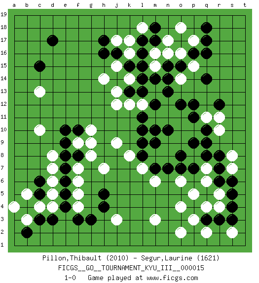 Last move : 1-0 2011 June 17 23:1:54 [Event "FICGS__GO__TOURNAMENT_KYU_III__000015"] [Site "FICGS"] [Date "2011.01.13"] [Round "1"] [Black "Pillon,Thibault"] [White "Segur,Laurine"] [Result "1-0"] [Rating 1 "2010"] [Rating 2 "1621"] 1.q16 q4 2.d17 d4 3.c6 c10 4.c3 c4 5.d3 f4 6.b4 b5 7.c5 b3 8.e4 d5 9.e5 d6 10.f3 f5 11.e6 d7 12.b2 a4 13.g3 f6 14.e7 f7 15.e8 d8 16.c15 c13 17.r6 k16 18.h17 o16 19.q14 r10 20.r12 m3 21.r3 r4 22.q3 o2 23.p4 p3 24.s4 p5 25.s5 o4 26.q8 p10 27.m17 m16 28.l17 f9 29.f8 g8 30.e9 g10 31.f10 g9 32.e10 k17 33.l16 m15 34.l15 j15 35.m14 n17 36.n14 p17 37.q17 o18 38.l13 k14 39.l14 j12 40.k13 j13 41.k15 h14 42.j16 j17 43.h16 l18 44.m18 s8 45.q18 o14 46.o15 p15 47.n15 n16 48.p16 j3 49.h5 h7 50.h4 j9 51.p7 q6 52.r7 m6 53.l10 o9 54.n7 s7 55.o8 n9 56.l8 m8 57.m7 l7 58.m9 n8 59.n10 k8 60.l9 l12 61.m12 s2 62.s3 q2 63.p9 o10 64.q10 q11 65.q9 o6 66.o7 q7 67.r8 r11 68.p11 o11 69.p12 n11 70.m10 m11 71.l11 n12 72.n13 m13 73.o12 k12 74.m12 r5 75.s6 1-0 Here are the names of the openings (joseki) played in the four corners : Corner d4 : d4 c6 Hoshi (Hwajeom, Seongjeom, Xingwei`) 4-4 Point. The star or hoshi (4-4) point, emphasizing influence at the potential expense of territory. Ikken Kakari (Hankan Keolch'im, Yi Gua`jiao~, 1-Space Low Approach). Black 2 is the standard approach move to the 4-4. Corner q4 : q4 r6 Hoshi (Hwajeom, Seongjeom, Xingwei`) 4-4 Point. The star or hoshi (4-4) point, emphasizing influence at the potential expense of territory. Ikken Kakari (Hankan Keolch'im, Yi Gua`jiao~, 1-Space Low Approach). Black 2 is the standard approach move to the 4-4. Corner q16 : q16 o16 Hoshi (Hwajeom, Seongjeom, Xingwei`) 4-4 Point. The star or hoshi (4-4) point, emphasizing influence at the potential expense of territory. Ikken Takagakari (Hankan Nop'dakeolch'im, Yi Gaojia, 1-Space High Approach). Black typically responds at 6-4 or 3-10. Black 4-10 is played when Black finds play on the right side advantageous. Black 4-8 or 3-8 may be played when Black has support at top. Player Black won this Go (weiqi, baduk) game. Follow this game move after move (download)Beware of the clumsy double contact. (Anonymous) Memory is a way of holding onto the things you love, the things you are, the things you never want to lose. (from the television show: The Wonder Years)