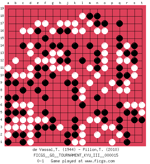 Last move : 0-1 2011 May 26 13:34:47 [Event "FICGS__GO__TOURNAMENT_KYU_III__000015"] [Site "FICGS"] [Date "2011.01.13"] [Round "1"] [Black "de Vassal,Thibault"] [White "Pillon,Thibault"] [Result "0-1"] [Rating 1 "1944"] [Rating 2 "2010"] 1.q4 d16 2.q17 d4 3.q11 n16 4.q15 j17 5.c14 c16 6.e14 c10 7.f15 f17 8.f3 h3 9.f5 d6 10.f7 d2 11.c8 c6 12.e8 o3 13.b7 r6 14.o4 n4 15.o5 p3 16.r5 r9 17.q9 q8 18.r10 p9 19.q10 r8 20.n5 m4 21.b5 b6 22.a6 b4 23.a4 b3 24.c5 d5 25.e2 e12 26.f13 f10 27.g10 g11 28.f11 f12 29.e11 d11 30.e10 e9 31.f9 d10 32.d9 d13 33.h14 d14 34.q6 s6 35.s5 o8 36.k14 g13 37.g14 h11 38.l17 l16 39.n18 m17 40.l6 m9 41.m14 o14 42.n13 o13 43.n12 o12 44.l12 q13 45.r13 r14 46.q14 r12 47.s13 q12 48.s12 s11 49.s14 s10 50.n11 o11 51.q3 k10 52.j12 j11 53.h12 g12 54.j16 k16 55.j9 h13 56.j13 m11 57.h16 h17 58.c2 a3 59.a5 c4 60.a7 d1 61.b2 e4 62.e3 f4 63.g3 d3 64.g4 b1 65.k3 l3 66.k4 n2 67.k2 l2 68.e16 e17 69.m18 t5 70.t4 t6 71.s4 l18 72.n17 k17 73.b9 b10 74.c1 a2 75.a1 c3 76.k9 q2 77.r2 p1 78.r1 o16 79.o17 k1 80.j1 l1 81.j2 l8 82.k8 l7 83.k7 n10 84.a10 a11 85.a9 b12 86.n7 g16 0-1 Here are the names of the openings (joseki) played in the four corners : Corner d4 : d4 f3 Hoshi (Hwajeom, Seongjeom, Xingwei`) 4-4 Point. The star or hoshi (4-4) point, emphasizing influence at the potential expense of territory. Ikken Kakari (Hankan Keolch'im, Yi Gua`jiao~, 1-Space Low Approach). Black 2 is the standard approach move to the 4-4. Corner q4 : q4 o3 Hoshi (Hwajeom, Seongjeom, Xingwei`) 4-4 Point. The star or hoshi (4-4) point, emphasizing influence at the potential expense of territory. Ikken Kakari (Hankan Keolch'im, Yi Gua`jiao~, 1-Space Low Approach). White 2 is the standard approach move to the 4-4. Player White won this Go (weiqi, baduk) game. Follow this game move after move (download)Be a little patient. Keshi works ! (Anonymous) Without enthusiasm, virtue functions not at all, and vice only poorly. (Mignon McLaughlin, The Neurotic's Notebook, 1960)