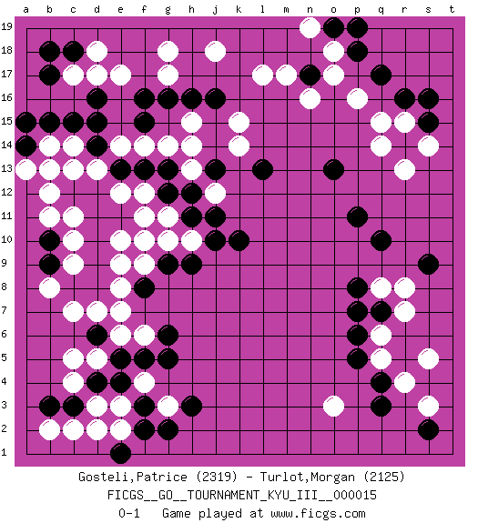 Last move : 0-1 2011 April 9 3:16:27 [Event "FICGS__GO__TOURNAMENT_KYU_III__000015"] [Site "FICGS"] [Date "2011.01.13"] [Round "1"] [Black "Gosteli,Patrice"] [White "Turlot,Morgan"] [Result "0-1"] [Rating 1 "2319"] [Rating 2 "2125"] 1.k10 c4 2.r16 d17 3.q3 p16 4.e4 g3 5.n17 l17 6.c3 d3 7.d4 e3 8.f3 f4 9.f2 c2 10.b3 e2 11.g2 c5 12.d6 b2 13.h3 d5 14.e5 e6 15.f5 f6 16.g5 d7 17.q10 n16 18.q17 o17 19.d15 c13 20.d16 e17 21.d12 e14 22.d14 d13 23.f16 g14 24.f15 h15 25.e13 f14 26.c12 e12 27.f13 b14 28.b15 b12 29.b13 c14 30.c15 a13 31.e11 f12 32.g13 h13 33.g12 f11 34.d11 c10 35.f10 g11 36.h12 j12 37.h11 g10 38.a15 b11 39.j13 h14 40.g9 h10 41.j11 f9 42.h9 e10 43.j10 f10 44.f8 g18 45.h16 k15 46.j16 k14 47.c18 c17 48.b17 d18 49.b18 g17 50.g16 j18 51.d8 e8 52.e1 d2 53.a14 b13 54.d10 e9 55.d9 e7 56.b9 b8 57.b10 c9 58.c8 c11 59.g6 c7 60.q4 r8 61.q7 q8 62.p8 r7 63.p7 s5 64.s9 s3 65.s2 q6 66.p6 q5 67.p5 r4 68.l13 r15 69.s15 s14 70.r14 q15 71.s16 r13 72.p11 q14 73.p18 o18 74.o19 n19 75.p19 m17 76.o13 o3 0-1 Here are the names of the openings (joseki) played in the four corners : Corner q16 : r16 p16 Komoku (Somok, Xiao~mu`) 3-4 Point. The komoku (3-4) point is the traditional corner enclosure move.. Ikken Takagakari (Hankan Nop'dakeolch'im, Yi Gaogua`jiao~, 1-Space High Approach). The 5-4 approach move has become more popular in modern times, as modern Go emphasizes speed and influence. Corner d4 : c4 e4 Komoku (Somok, Xiao~mu`) 3-4 Point. The komoku (3-4) point is the traditional corner enclosure move.. Ikken Takagakari (Hankan Nop'dakeolch'im, Yi Gaogua`jiao~, 1-Space High Approach). The 5-4 approach move has become more popular in modern times, as modern Go emphasizes speed and influence. Corner d16 : d17 d15 Komoku (Somok, Xiao~mu`) 3-4 Point. The komoku (3-4) point is the traditional corner enclosure move.. Ikken Takagakari (Hankan Nop'dakeolch'im, Yi Gaogua`jiao~, 1-Space High Approach). The 5-4 approach move has become more popular in modern times, as modern Go emphasizes speed and influence. Player White won this Go (weiqi, baduk) game. Follow this game move after move (download)To reduce an opponent's large prospective territory, strike at the shoulder. (Anonymous) The message for business people contemplating their place in the cyberspace is simple and direct: get linked or get lost. (Vic Sussman and Kenan Pollack)