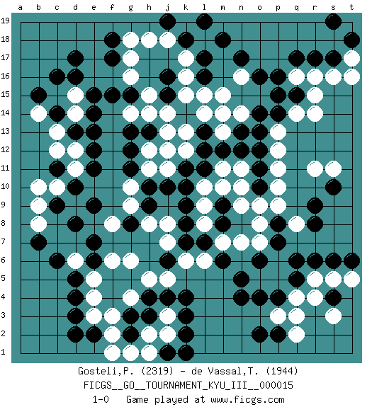 Last move : 1-0 2011 January 28 1:46:34 [Event "FICGS__GO__TOURNAMENT_KYU_III__000015"] [Site "FICGS"] [Date "2011.01.13"] [Round "1"] [Black "Gosteli,Patrice"] [White "de Vassal,Thibault"] [Result "1-0"] [Rating 1 "2319"] [Rating 2 "1944"] 1.k10 q3 2.d17 d15 3.q5 p5 4.e15 d14 5.q6 q4 6.d16 q16 7.d4 k16 8.k4 g4 9.o4 o5 10.n4 o7 11.p4 q8 12.s4 s3 13.r8 r5 14.r6 s5 15.s6 t5 16.r9 o9 17.o11 p10 18.p7 p6 19.p8 o8 20.n5 m7 21.o6 p11 22.o12 p12 23.o10 p9 24.o13 q14 25.o16 g16 26.f17 g17 27.f18 g18 28.e14 d12 29.e13 d11 30.c9 d9 31.d8 c10 32.e9 b9 33.d10 b8 34.d13 c13 35.c11 b10 36.e11 c12 37.e12 g6 38.q17 d6 39.e6 e5 40.d5 f6 41.e7 e4 42.c6 j3 43.k3 h14 44.r17 r16 45.s17 s16 46.p16 r11 47.p14 p13 48.q15 r15 49.p15 r14 50.k18 l18 51.l17 k17 52.m18 j18 53.l19 l14 54.j15 j14 55.j19 h18 56.j16 k12 57.l16 k15 58.b15 b14 59.c16 e3 60.d3 j2 61.e2 f2 62.d2 h11 63.p2 p3 64.o2 q2 65.s10 s11 66.t6 r4 67.k2 m10 68.g2 f1 69.g3 f3 70.h4 h5 71.j4 h8 72.h10 g10 73.h9 g9 74.g11 j8 75.k9 h12 76.l7 l8 77.m9 n9 78.k8 l6 79.k7 k6 80.g8 f8 81.j6 j7 82.m6 j5 83.m8 n7 84.l11 m11 85.m12 n10 86.l12 m13 87.l13 n14 88.o14 k13 89.g13 m15 90.n13 m14 91.h13 l10 92.k11 j13 93.g15 g14 94.f15 h15 95.g12 l15 96.c14 g1 97.j1 h2 98.h3 h1 99.k1 n16 100.n17 t17 101.t18 t16 102.s19 l9 103.j12 j11 104.j10 j12 105.b7 n11 106.n12 1-0 Here are the names of the openings (joseki) played in the four corners : Corner d16 : d17 d15 Komoku (Somok, Xiao~mu`) 3-4 Point. The komoku (3-4) point is the traditional corner enclosure move.. Ikken Takagakari (Hankan Nop'dakeolch'im, Yi Gaogua`jiao~, 1-Space High Approach). The 5-4 approach move has become more popular in modern times, as modern Go emphasizes speed and influence. Corner q4 : q3 q5 Komoku (Somok, Xiao~mu`) 3-4 Point. The komoku (3-4) point is the traditional corner enclosure move.. Ikken Takagakari (Hankan Nop'dakeolch'im, Yi Gaogua`jiao~, 1-Space High Approach). The 5-4 approach move has become more popular in modern times, as modern Go emphasizes speed and influence. Corner d4 : d4 g4 Hoshi (Hwajeom, Seongjeom, Xingwei`) 4-4 Point. The star or hoshi (4-4) point, emphasizing influence at the potential expense of territory. Niken Takagakari (Dukan Nop'dakeolch'im, E`r Gaojia, 2-Space High Approach). White 2 is a light approach move. Rarely played in even games, White 2 is typically employed in handicap games. Black continues with 6-4 or 3-10. In Korean Sunjang Baduk Black has a stone on 8-4. Corner q16 : q16 o11 Hoshi (Hwajeom, Seongjeom, Xingwei`) 4-4 Point. The star or hoshi (4-4) point, emphasizing influence at the potential expense of territory. Player Black won this Go (weiqi, baduk) game. Follow this game move after move (download)Keep sente in the opening. A premature attack loses sente. (Anonymous) For a mechanic, you seem to do an excessive amount of thinking. (C-3PO in Star Wars ep.2)