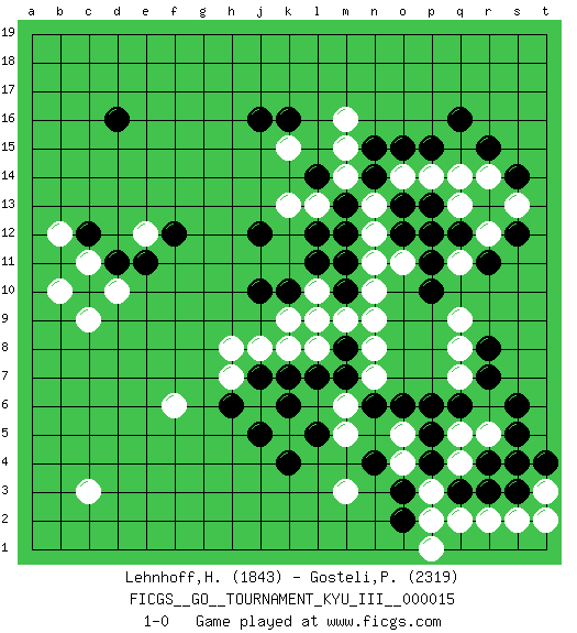 Last move : 1-0 2011 April 9 3:16:27 [Event "FICGS__GO__TOURNAMENT_KYU_III__000015"] [Site "FICGS"] [Date "2011.01.13"] [Round "1"] [Black "Lehnhoff,Heinz-Georg"] [White "Gosteli,Patrice"] [Result "1-0"] [Rating 1 "1843"] [Rating 2 "2319"] 1.q16 c3 2.q3 f6 3.d16 d10 4.c12 e12 5.c10 c9 6.d11 b10 7.e11 c11 8.f12 b12 9.k16 q5 10.r7 p3 11.p4 q4 12.o3 p2 13.o2 q2 14.r3 r2 15.s3 s2 16.s5 s4 17.r4 r5 18.t4 t2 19.s6 t3 20.s4 o4 21.p5 o5 22.p6 m3 23.o6 m5 24.m7 n7 25.n6 m6 26.l7 n8 27.l9 m9 28.m10 n10 29.m11 n11 30.m12 n12 31.m13 q8 32.r8 q7 33.q6 q9 34.q12 n13 35.n14 m14 36.l14 m15 37.n15 m16 38.p15 q13 39.p13 p12 40.p11 p14 41.o12 q14 42.o13 o14 43.o15 o11 44.p12 r12 45.r11 q11 46.p10 l10 47.r13 l13 48.l12 k13 49.k10 l8 50.l11 k8 51.m8 n9 52.k7 j8 53.j7 h7 54.j5 j6 55.k6 k5 56.h6 h8 57.k4 k9 58.j10 l10 59.j12 l9 60.l5 k15 61.n4 p1 62.j16 r14 63.s12 s13 64.s14 r12 65.r15 1-0 Here are the names of the openings (joseki) played in the four corners : Corner q4 : q3 q5 Komoku (Somok, Xiao~mu`) 3-4 Point. The komoku (3-4) point is the traditional corner enclosure move.. Ikken Takagakari (Hankan Nop'dakeolch'im, Yi Gaogua`jiao~, 1-Space High Approach). The 5-4 approach move has become more popular in modern times, as modern Go emphasizes speed and influence. Player Black won this Go (weiqi, baduk) game. Follow this game move after move (download)Attach to the strongest stone in a pincer. (Anonymous) Only sick music makes money today. (Friedrich Nietzsche)